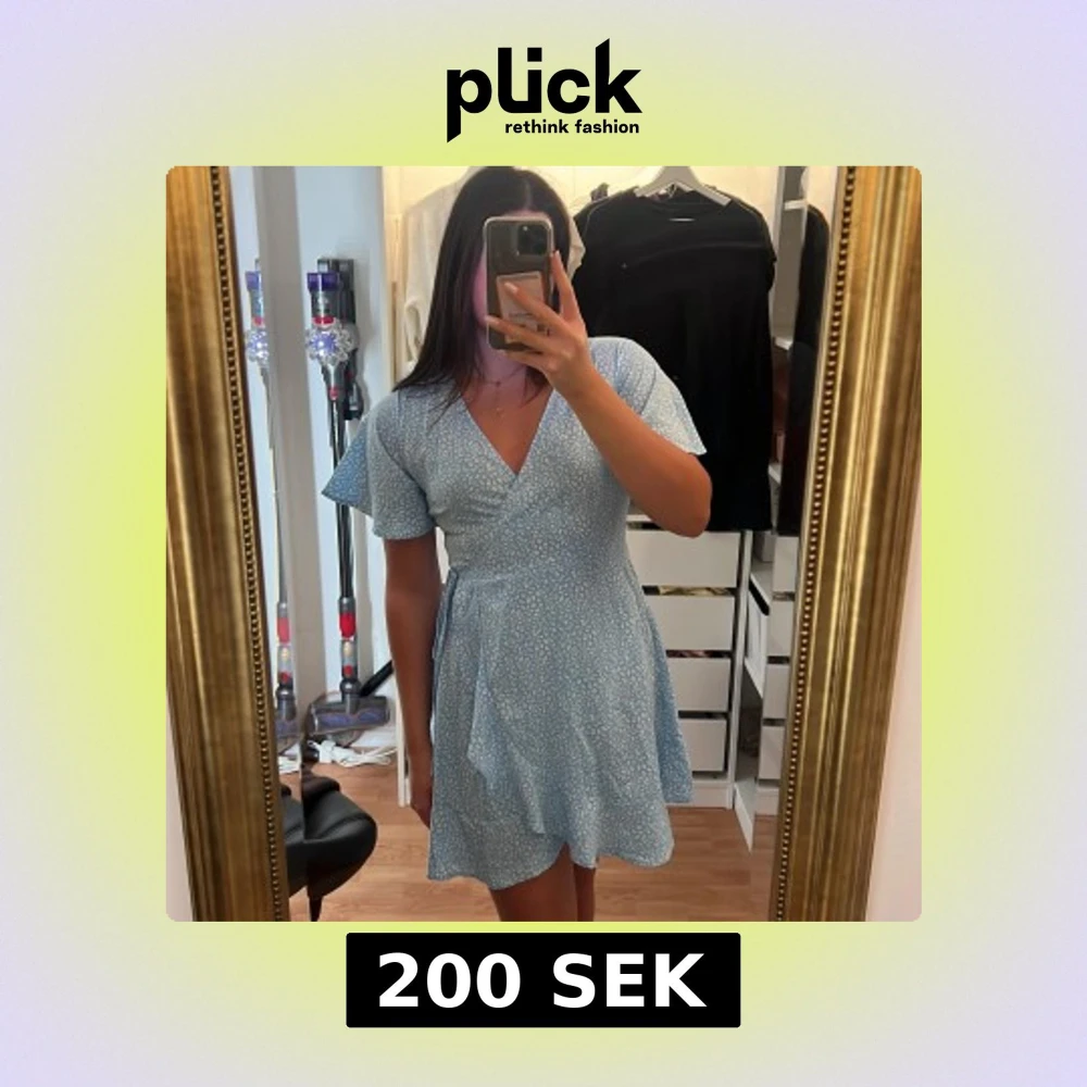 Supersöt ljusblå kort omlottklänning med vitt småmönster. Klänningen har v-ringning, korta vida ärmar och knyt i midjan för en snygg passform. Perfekt för varma dagar och ger en fräsch och somrig vibe. Liten i storleken så skulle säga att en M/L passar i den
