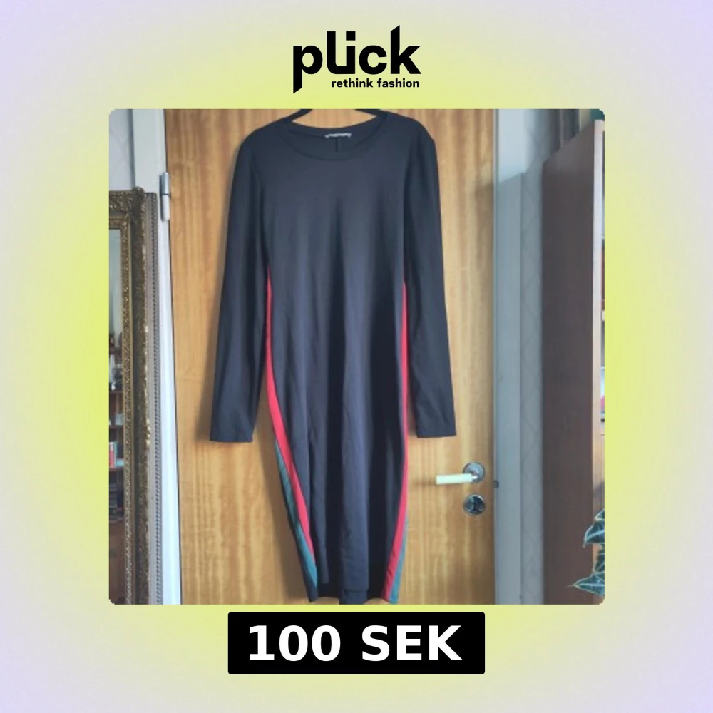 Snygg svart långärmad klänning från Zara Trafaluc med färgglada ränder i rött och grönt längs sidorna. Perfekt för en stilren look med en twist. Klänningen har en enkel rund halsringning och är tillverkad i ett mjukt material.