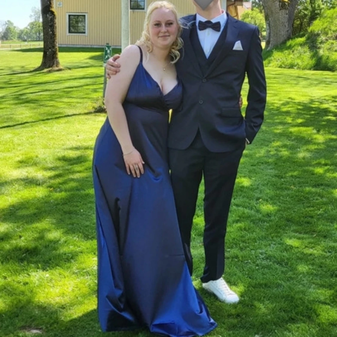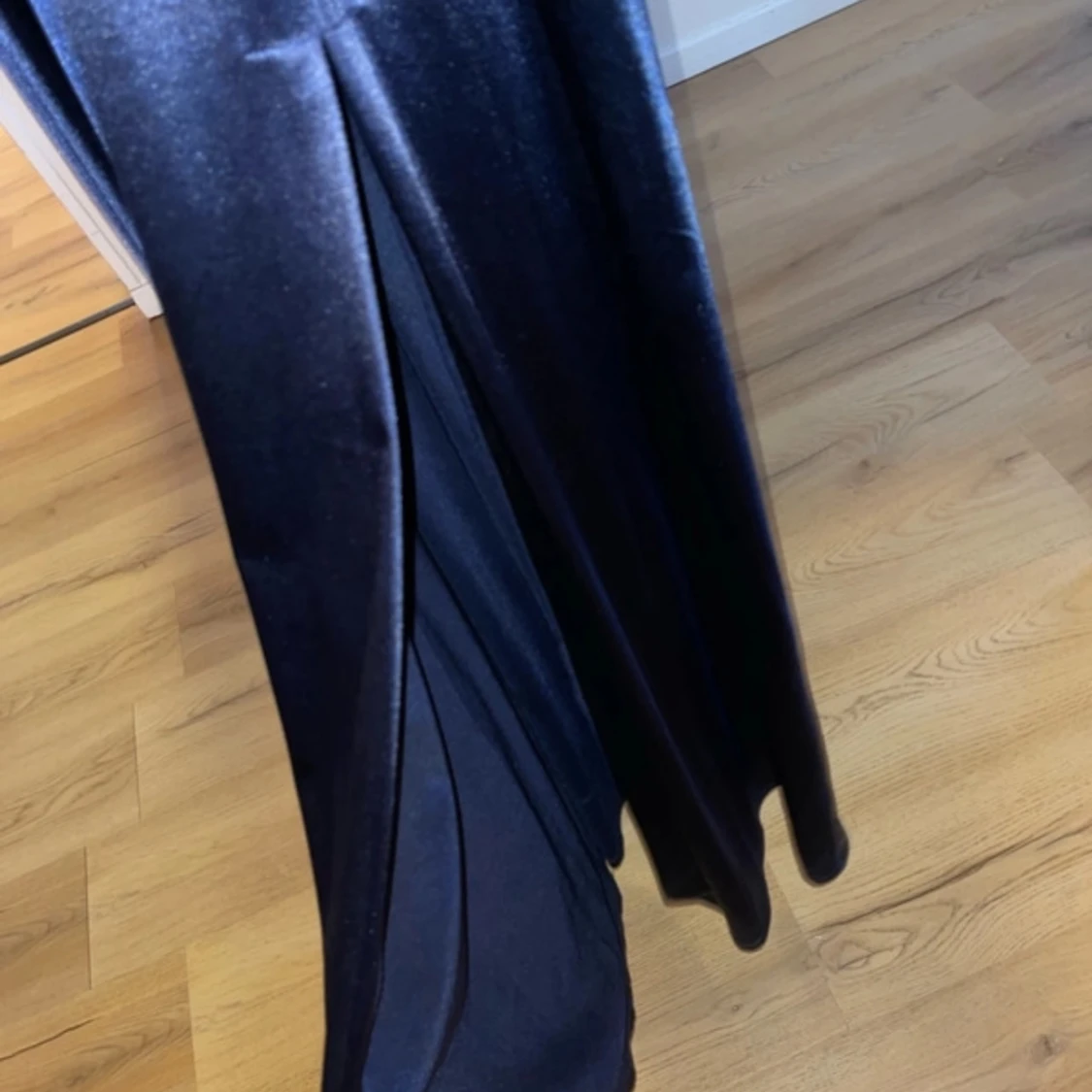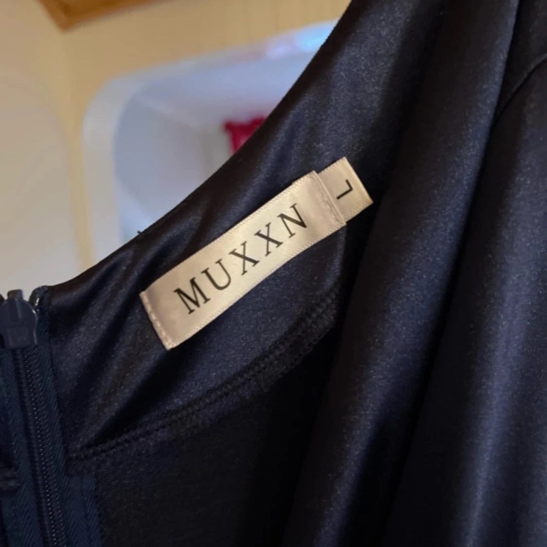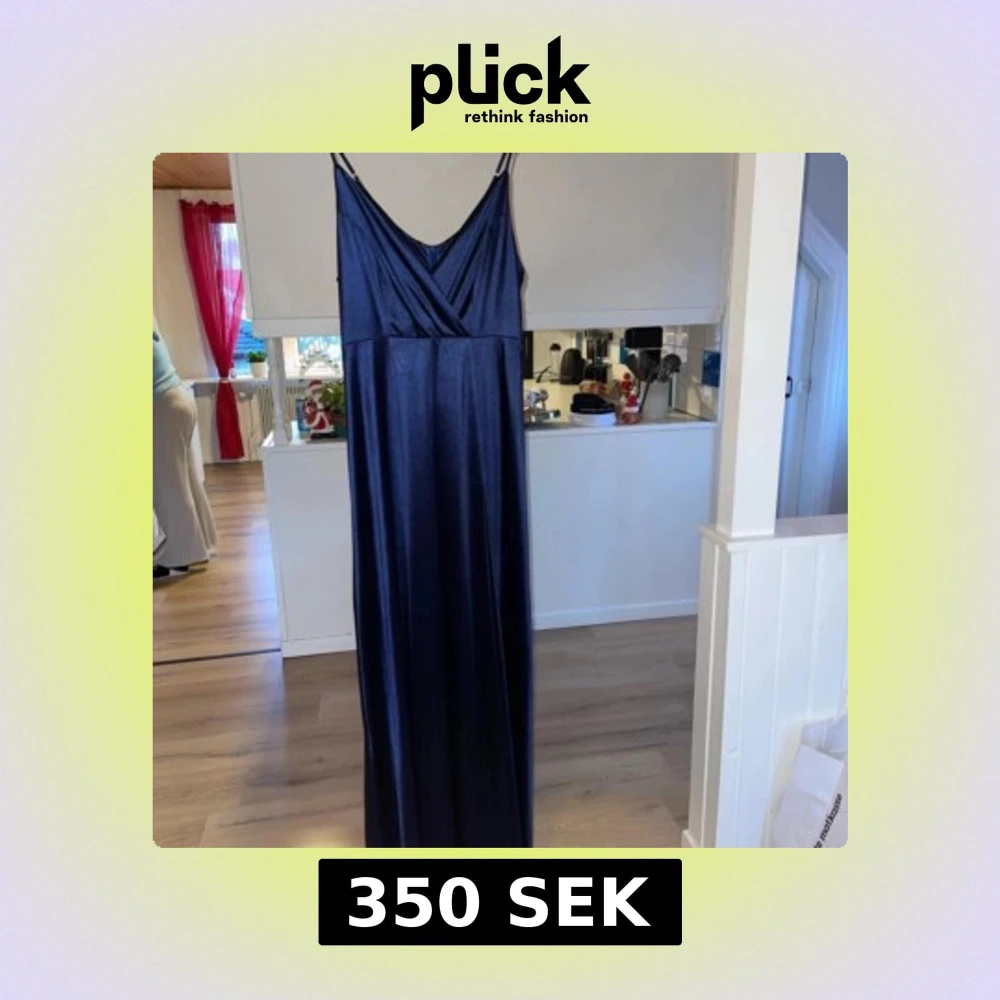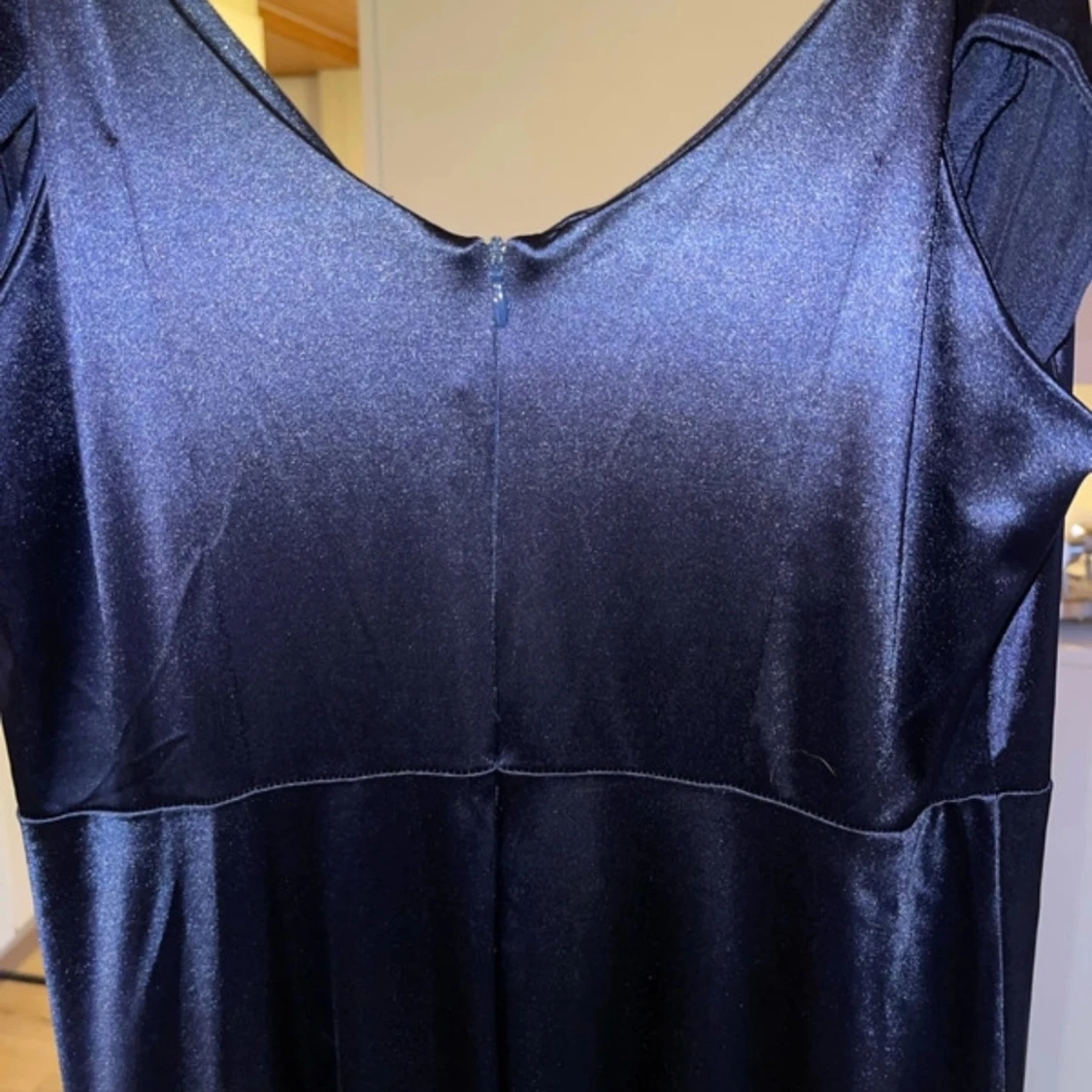 Elegant mörkblå långklänning från Muxxn i ett glansigt material. Klänningen har smala axelband och en v-ringad design som ger en stilren look. Använd vid bara ett tillfälle så fortfarande i ett bra skick