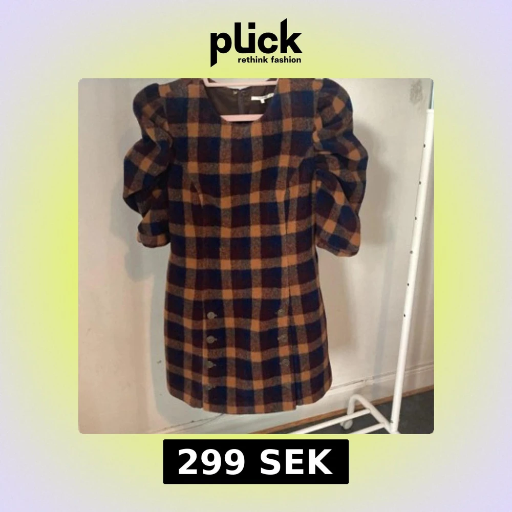Superfin kortklänning från Tularosa med stora puffärmar och rutigt mönster i blått, brunt och beige. Klänningen har rund halsringning, dekorativa knappar framtill och är gjord i ett mjukt, ulligt material. Perfekt för dig som gillar statement-ärmar och retrovibbar.