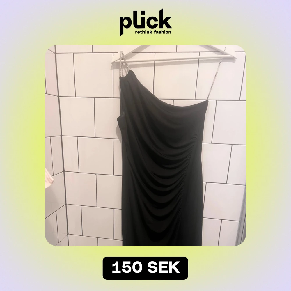 Snygg svart klänning i one-shoulder stil med glittriga axelband. Perfekt för festliga tillfällen med en elegant slits framtill. Klänningen har en draperad design som ger en smickrande passform. Ett måste för en glamorös kväll!
