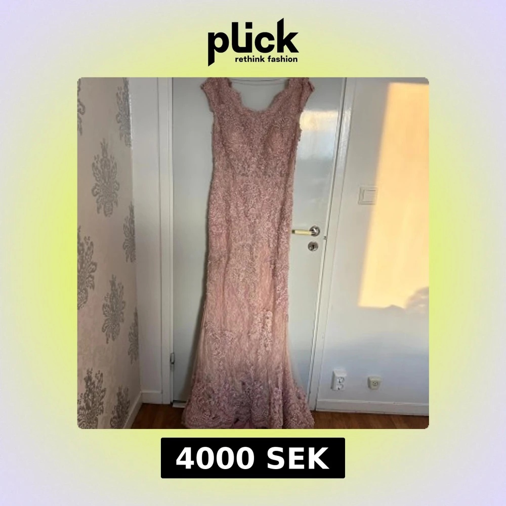 Superfin långklänning i ljusrosa spets med massor av broderade detaljer och pärlor. Klänningen har en elegant, figurnära passform och är ärmlös. Perfekt för bal eller fest, med vacker släp och exklusiv känsla. Använt den 1 gång, nypris 6000kr men går att diskutera vid snabb affär