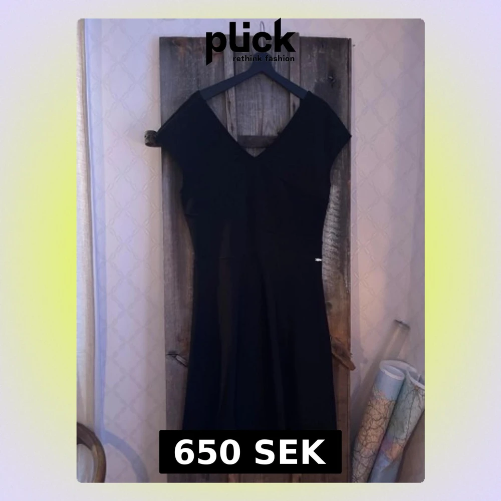 Snygg svart klänning från Armani Exchange i storlek L. Klänningen har v-ringning både fram och bak, är ärmlös och har en klassisk, figurnära passform med lätt utställd kjol. Perfekt för dig som gillar stilrena och tidlösa plagg.