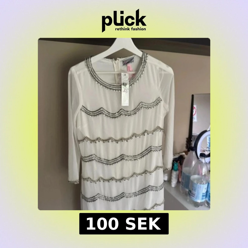 Supersnygg vit kortklänning från Lipsy med pärl- och paljettbroderier i vågiga rader. Klänningen har trekvartsärm, rund halsringning och dragkedja bak. Perfekt för dig som vill sticka ut med glittriga detaljer och elegant look.