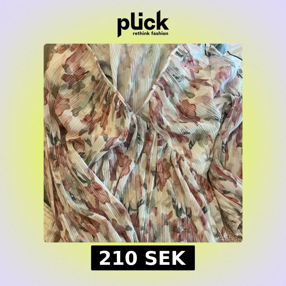 Superfin plisserad klänning med blommigt mönster i rosa, grönt och beige. Djup v-ringning och långa ärmar ger en romantisk vibe. Perfekt för dig som gillar flowiga och luftiga plagg med mycket rörelse.