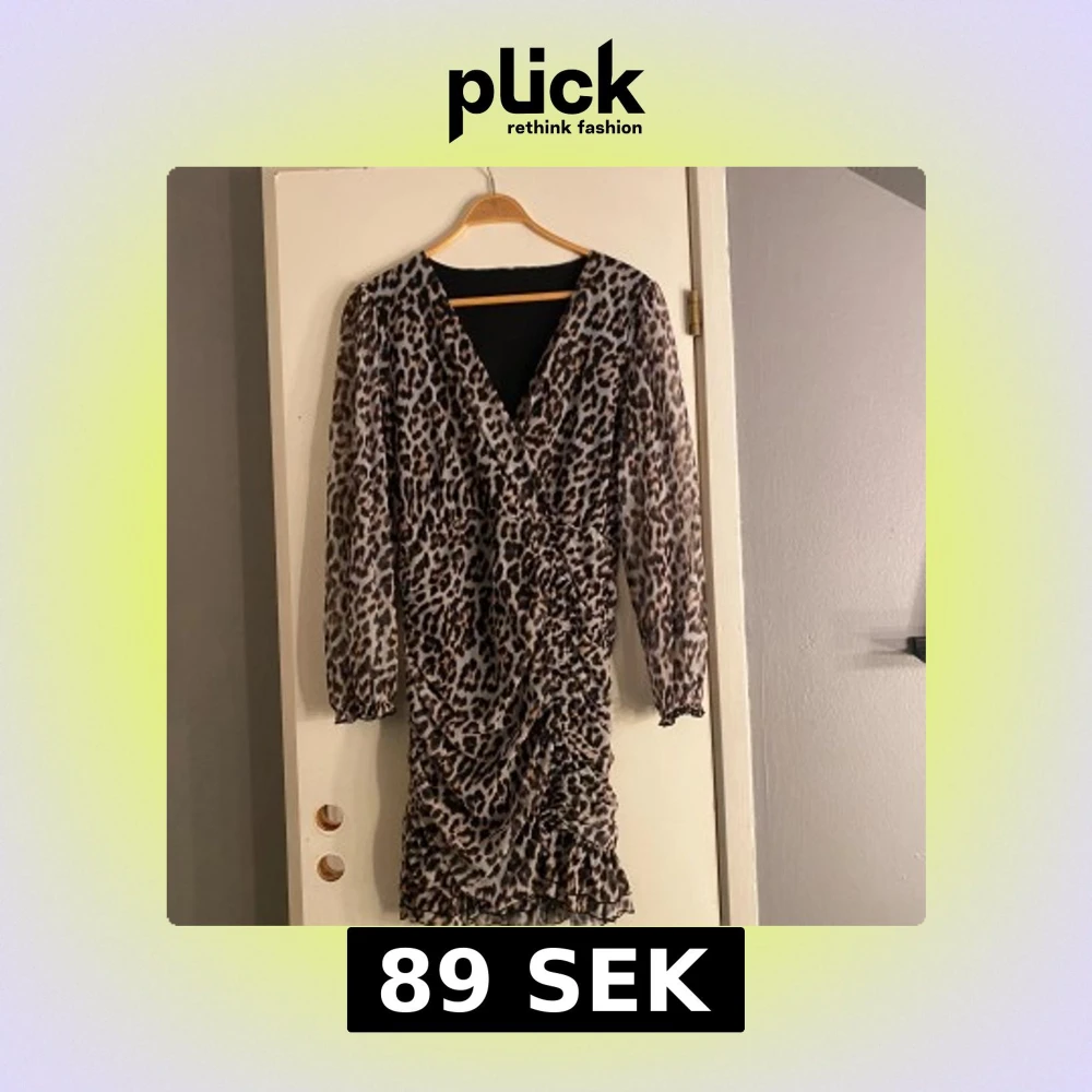 Snygg kort leopardmönstrad klänning med omlott och v-ringad front. Klänningen har långa, transparenta ärmar med volangdetalj vid ärmslut och rynkade detaljer längs kjolen. Materialet är lätt och ger en cool vibe, perfekt för dig som gillar att sticka ut.😎🐈⬛💛