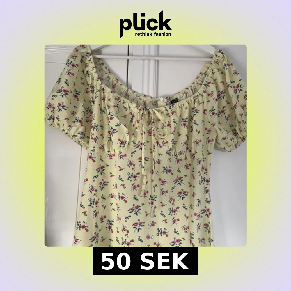 Söt långklänning från shein i ljusgul nyans med små rosa och vita blommor. Klänningen har korta puffärmar, snörning vid bysten.