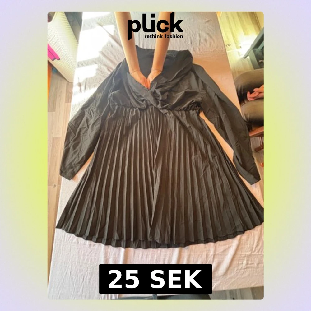 Snygg svart klänning med v-ringad omlottdesign och långa ärmar. Kjoldelen är plisserad vilket ger ett elegant fall. Perfekt för dig som gillar stilrena och klassiska plagg med en twist.