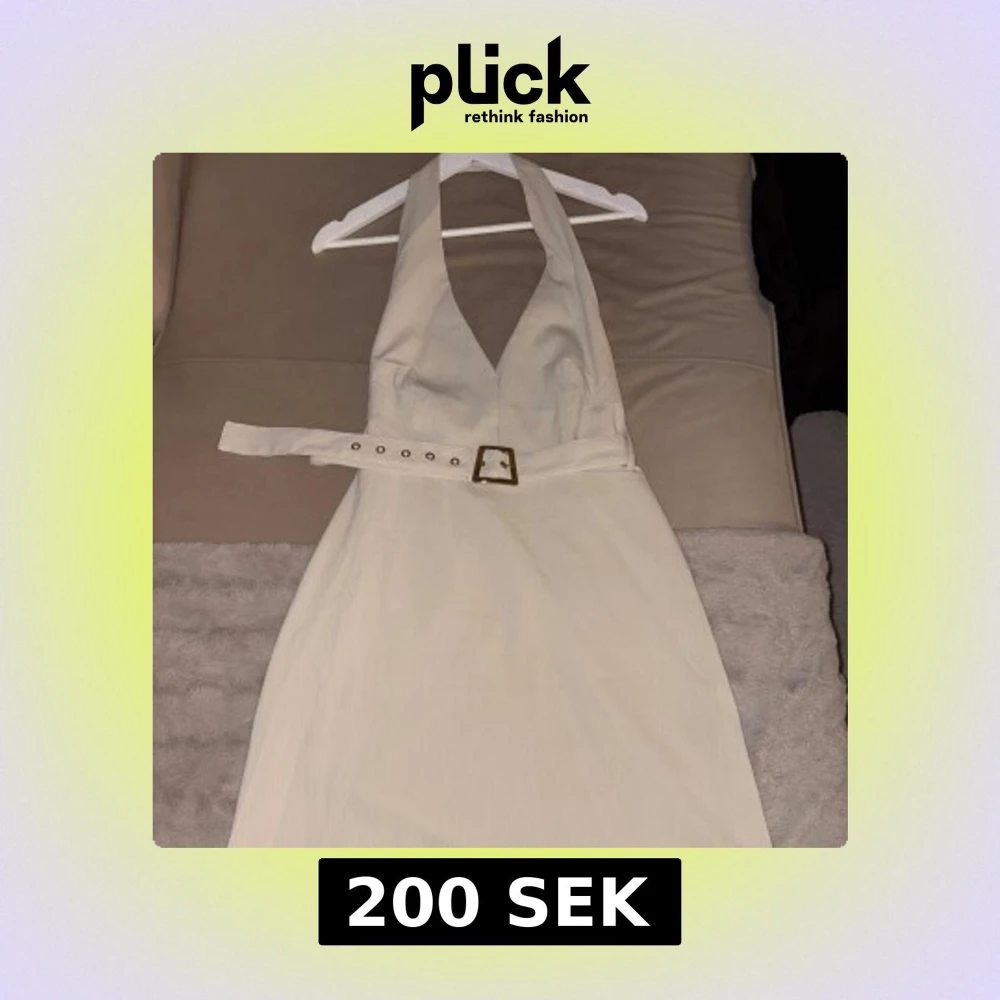Supersnygg beige skjort klänning med halterneck och markerad midja tack vare ett brett bälte med guldspänne. Klänningen har djup v-ringning och är ärmlös, perfekt för varma dagar. Materialet är lätt och har en diskret struktur.