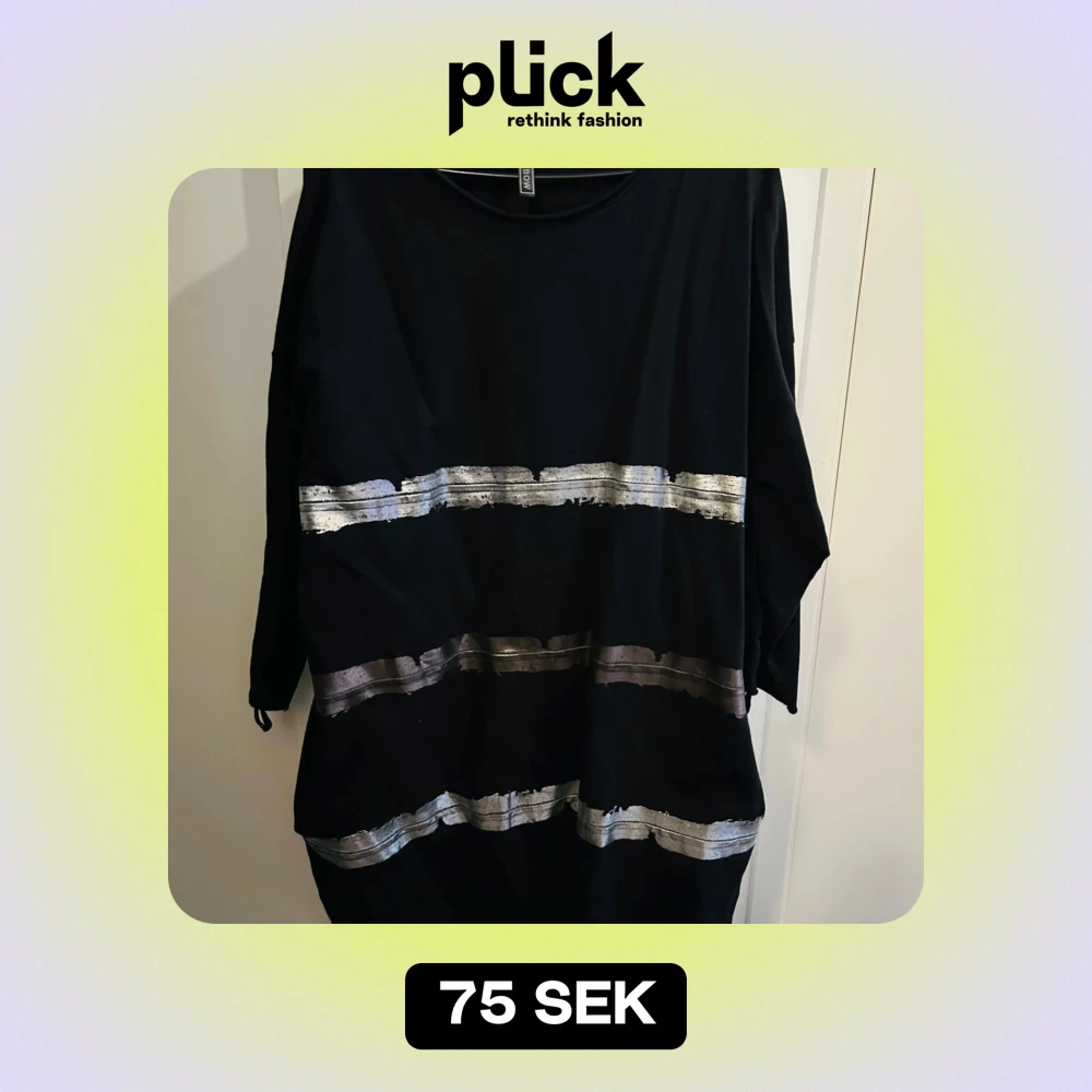 Snygg svart klänning från Rainbow i storlek L. Den har trekvartsärmar och coola silverfärgade ränder som ger en glittrig touch. Perfekt för en festlig kväll eller en utekväll med vänner. Klänningen är i bra skick och redo att bäras!