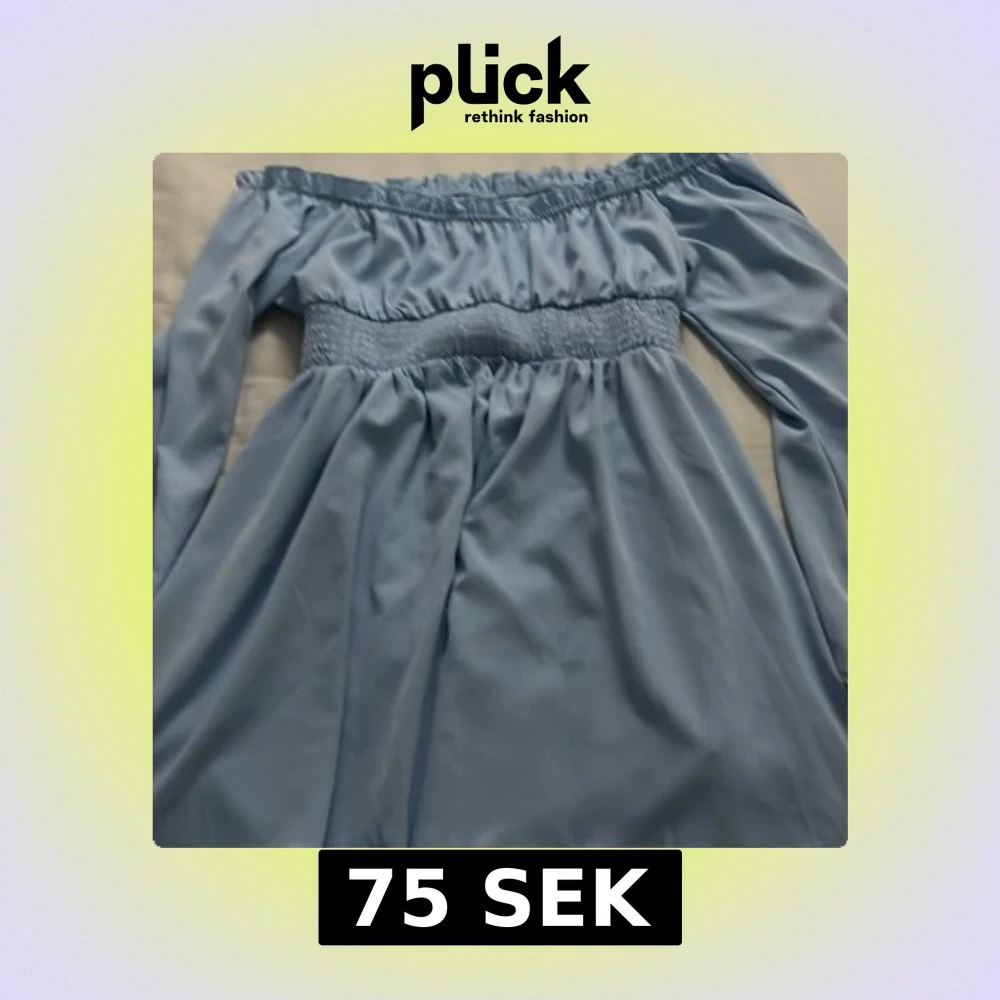 Charmig blå offshoulder klänning med volangdetaljer. Klänningen har en smockad midja som ger en fin passform och långa ärmar. Perfekt för sommarens alla tillfällen.