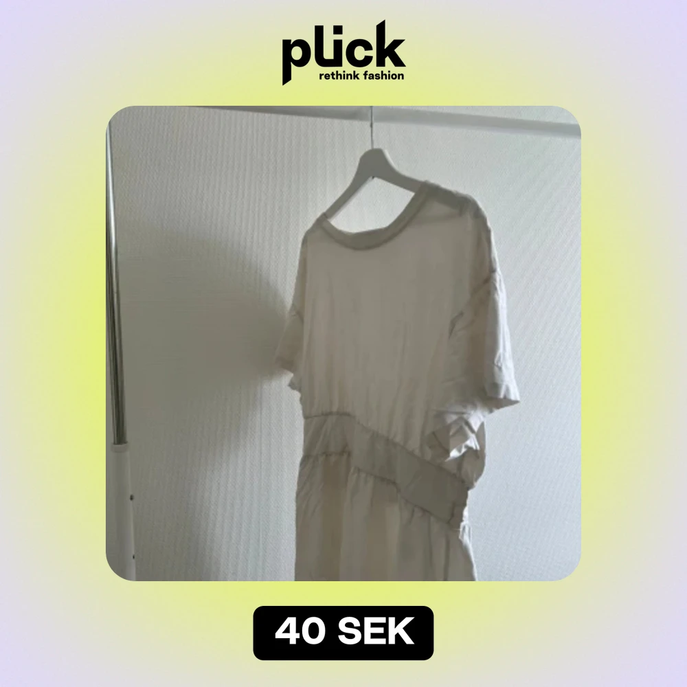 En vit klänning med korta ärmar och rund halsringning. Klänningen har en lös passform och är tillverkad i ett lätt material.