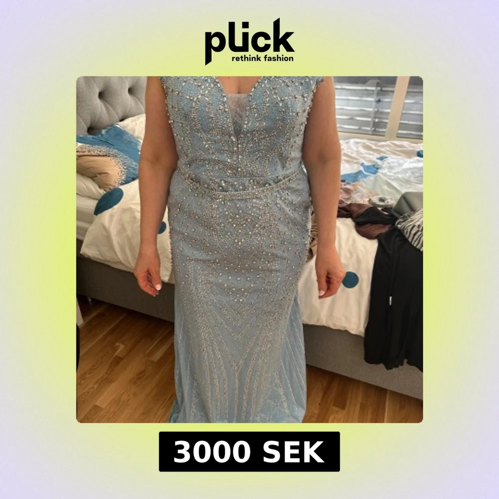 Säljer en elegant ljusblå långklänning med glittriga pärldetaljer och v-ringning. Klänningen har breda axelband och markerad midja, samt ett vackert mönster av pärlor och paljetter över hela tyget. Perfekt för bal eller fest! Den är bara använd en gång så den är som ny. Nypris ligger på 7000kr. Storleken passar till båden en L och XL