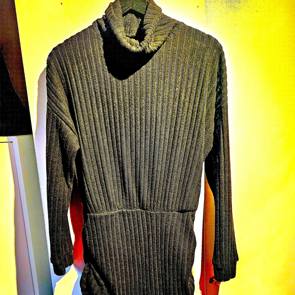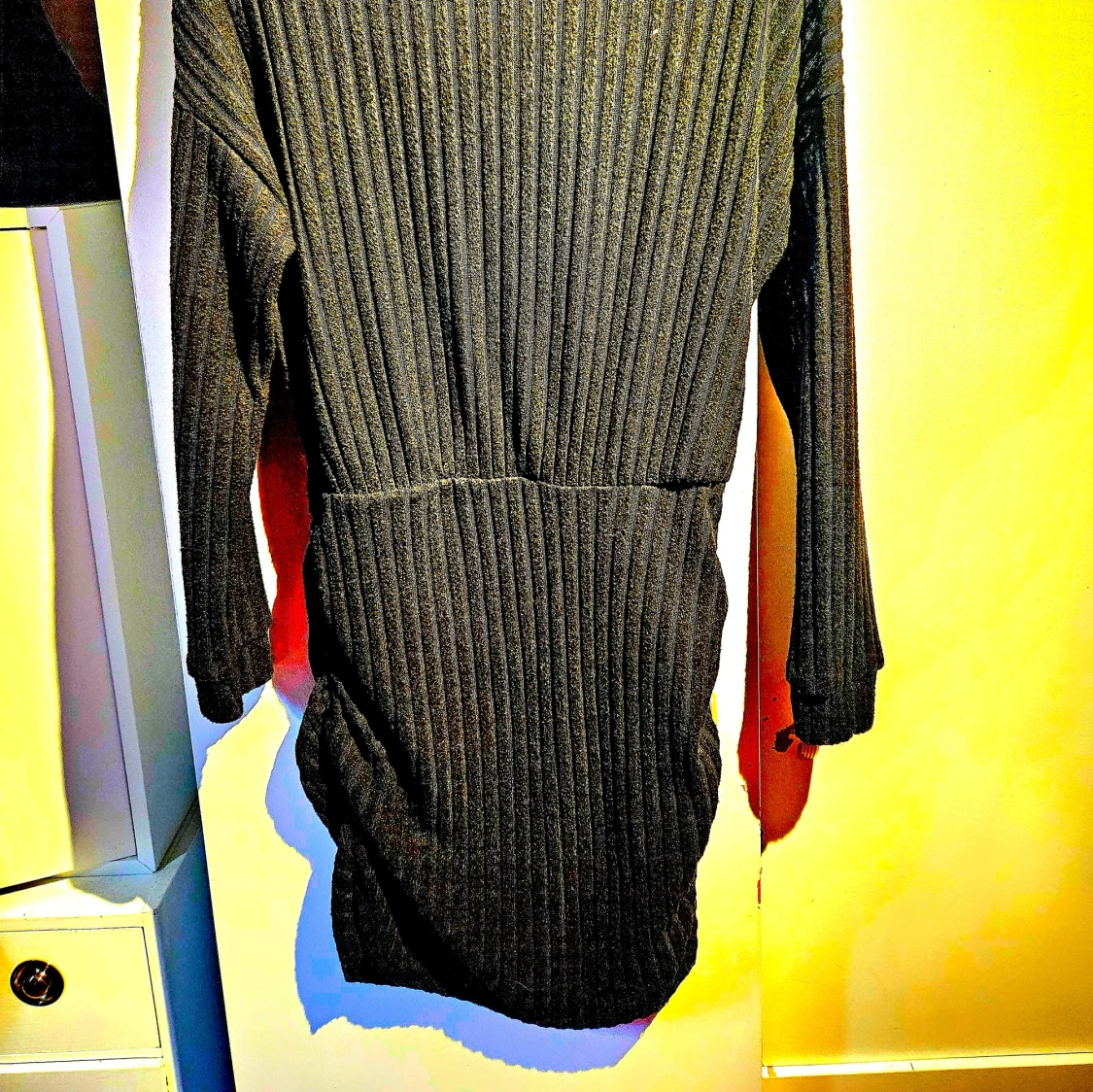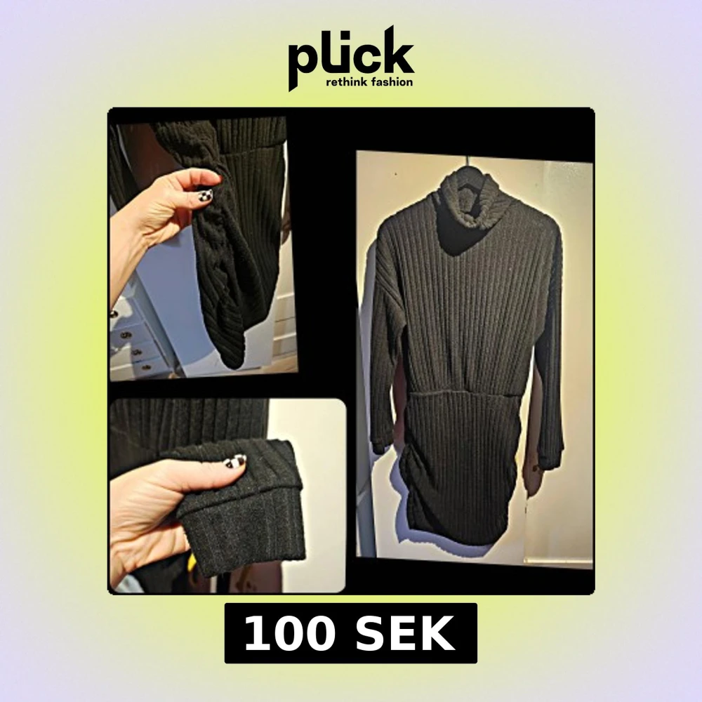 Mysig svart stickad klänning med polokrage och långa ärmar. Ribbat material som ger en snygg struktur och lite extra edge. Perfekt längd som slutar ovanför knäna och sitter skönt på kroppen. Ärmsluten är breda och viker sig snyggt.