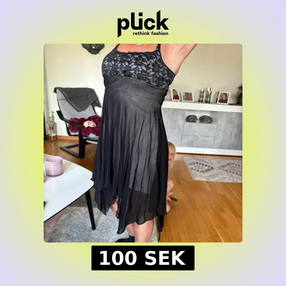Supersnygg svart kortklänning med transparent, flowy kjol och spets upptill. Axelbandsmodell med asymmetrisk nederkant och blommig spets över bysten. Perfekt för dig som vill sticka ut med en unik och feminin look.