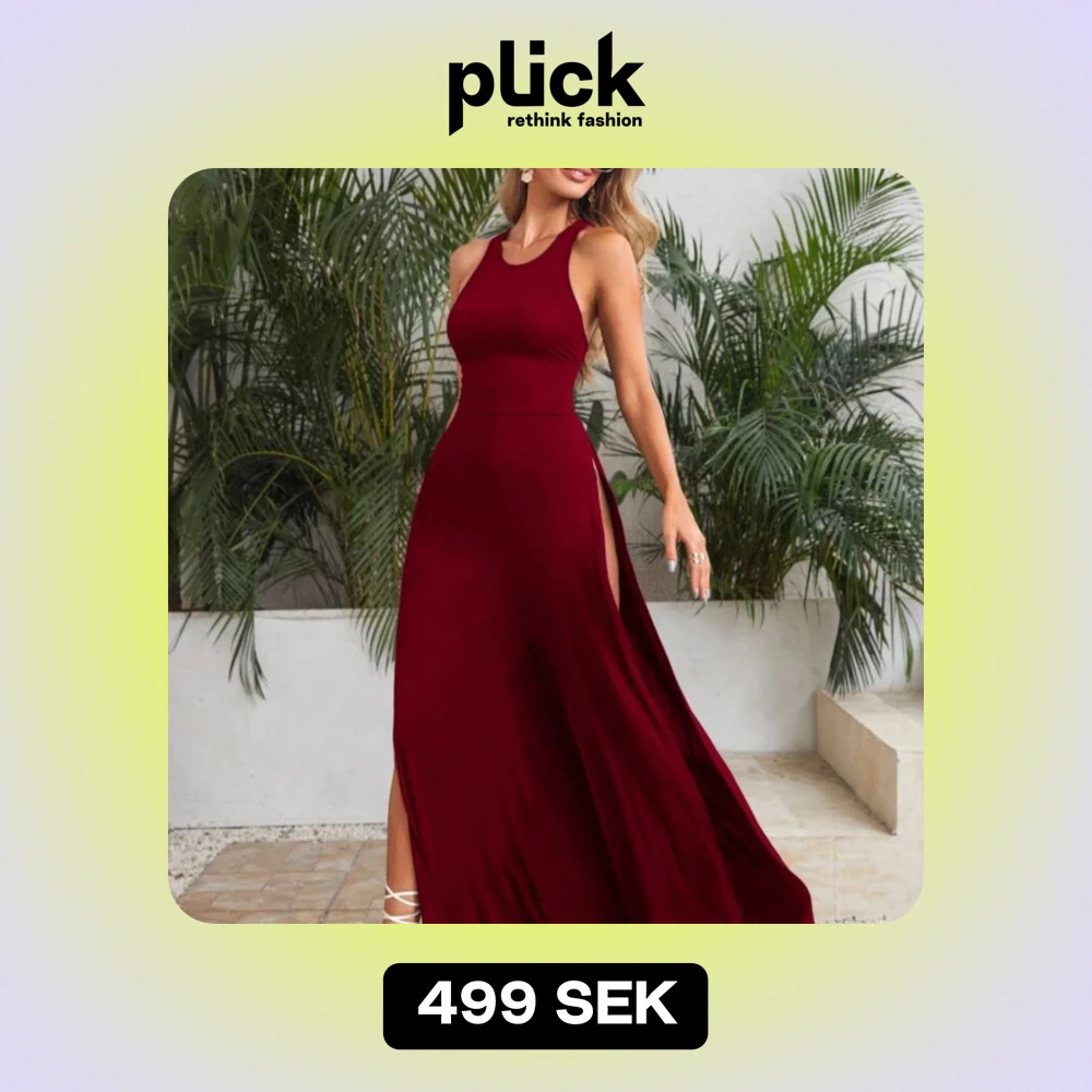 Snygg vinröd långklänning perfekt för fest! Den har en elegant snörning i ryggen och en hög slits som ger en extra touch. Klänningen är ärmlös och har en tight passform upptill. Perfekt för en kväll ute eller en speciell tillställning. 💃