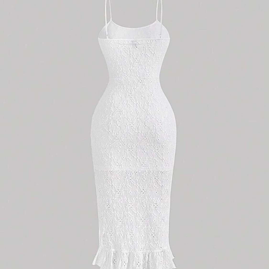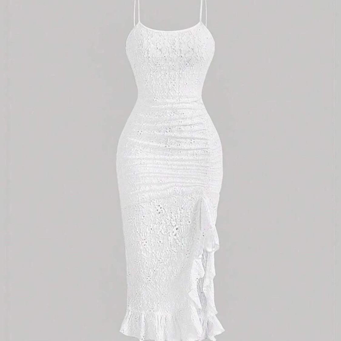Helt ny, Elegant vit klänning i spets med smala axelband och volangdetaljer längs sidan. Den har en tight passform som framhäver figuren och en vacker volangkant vid fållen. Perfekt för sommarens festligheter.
