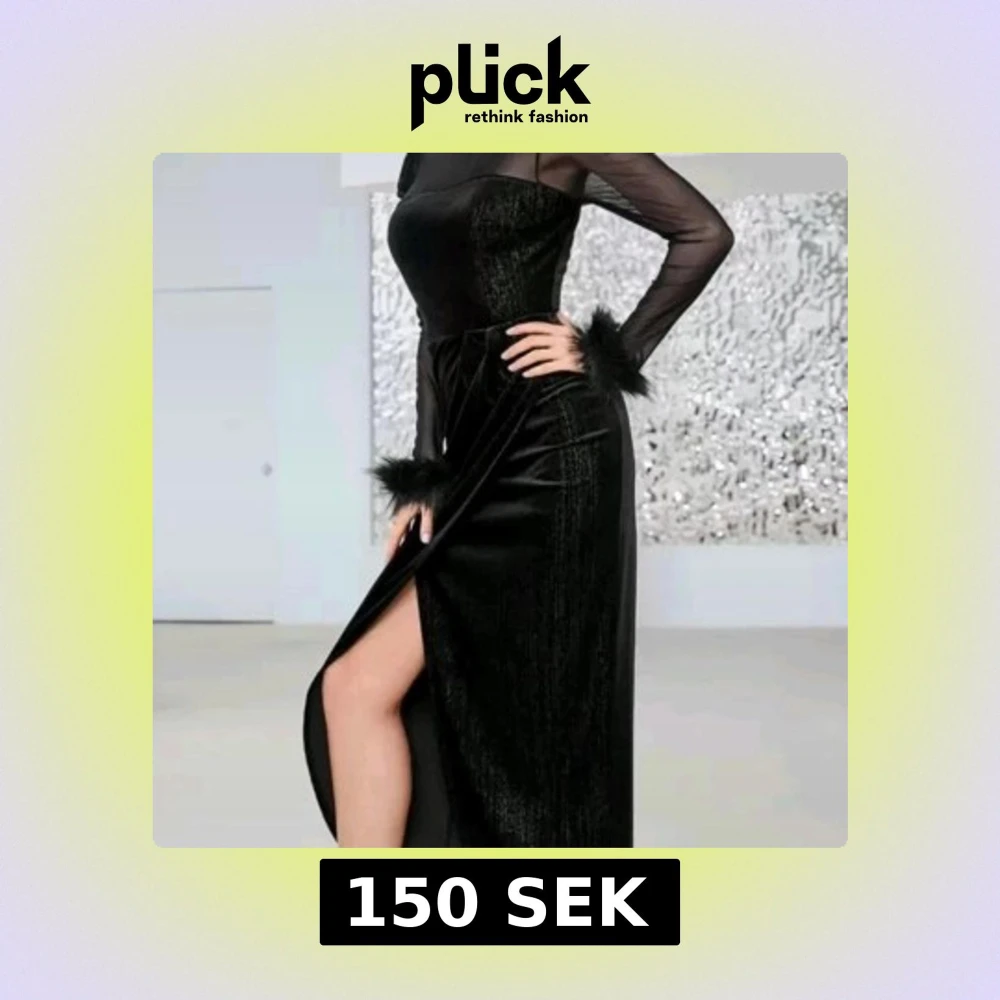 Supersnygg svart långklänning med glittrigt tyg, transparenta långärmar och fluffiga detaljer vid ärmsluten. Klänningen har en hög slits på sidan och en figurnära passform som ger en elegant siluett. Perfekt för dig som vill sticka ut med stil.