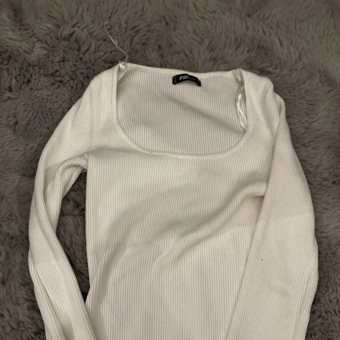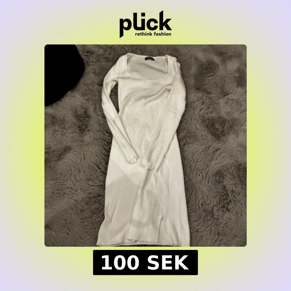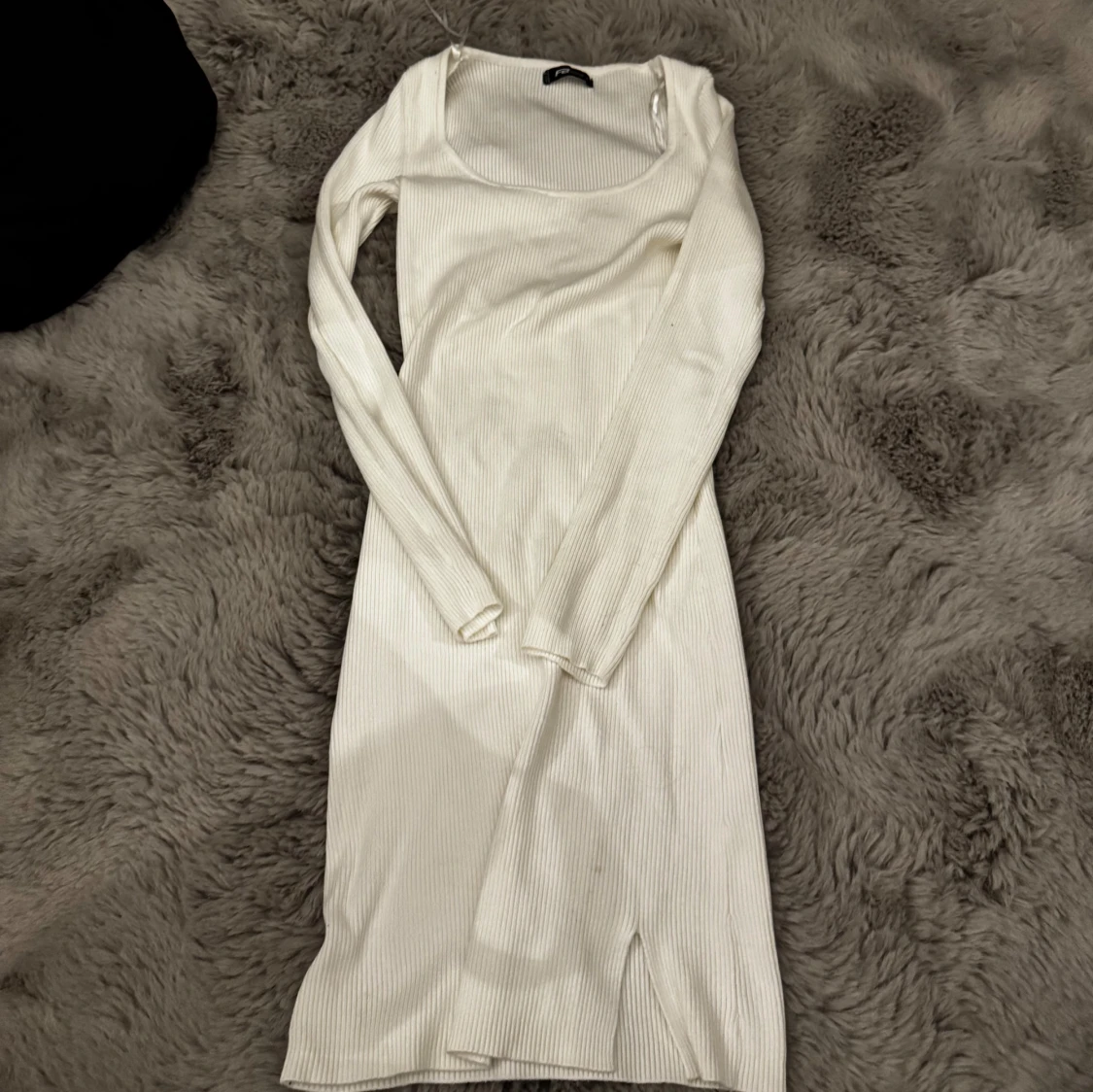 Snygg vit ribbad klänning med lång ärm och rundad urringning. Modellen är kroppsnära och har en liten slits nertill. Perfekt för dig som gillar stilrena och enkla plagg med en modern touch. Från New Yorker i storlek L