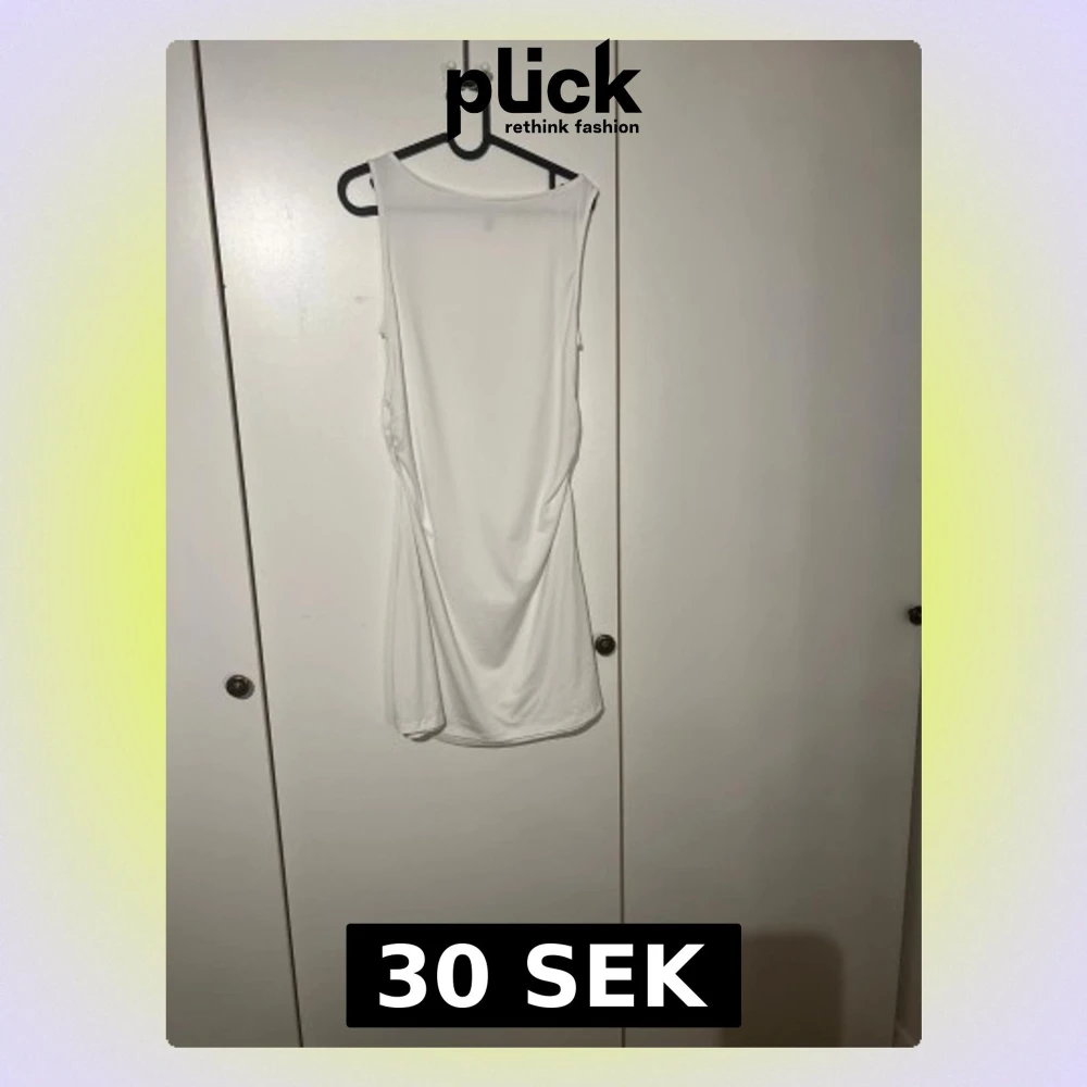 Säljer en vit, ärmlös kortklänning från H&M Divided i storlek L. Klänningen har en tight passform och snygg rynkdetalj på sidan som ger en cool look. Tillverkad i mjukt och stretchigt material, perfekt för varma dagar.
