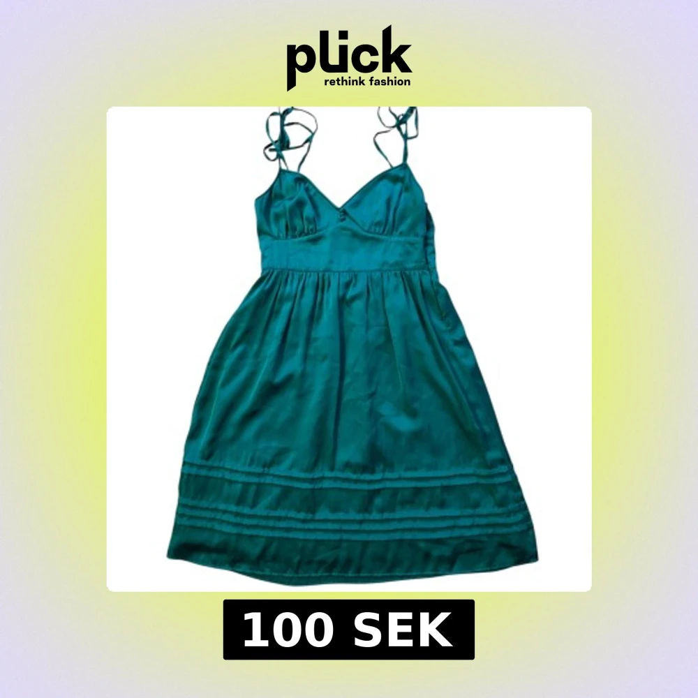 Supersöt grön kortklänning i glansigt material med smala axelband som knyts på axlarna. Klänningen har markerad midja, lätt v-ringning och fina veckdetaljer nertill. Perfekt för sommarens alla tillfällen! Den ser mer emerald och turkos i bilden men egentligen är den grön!