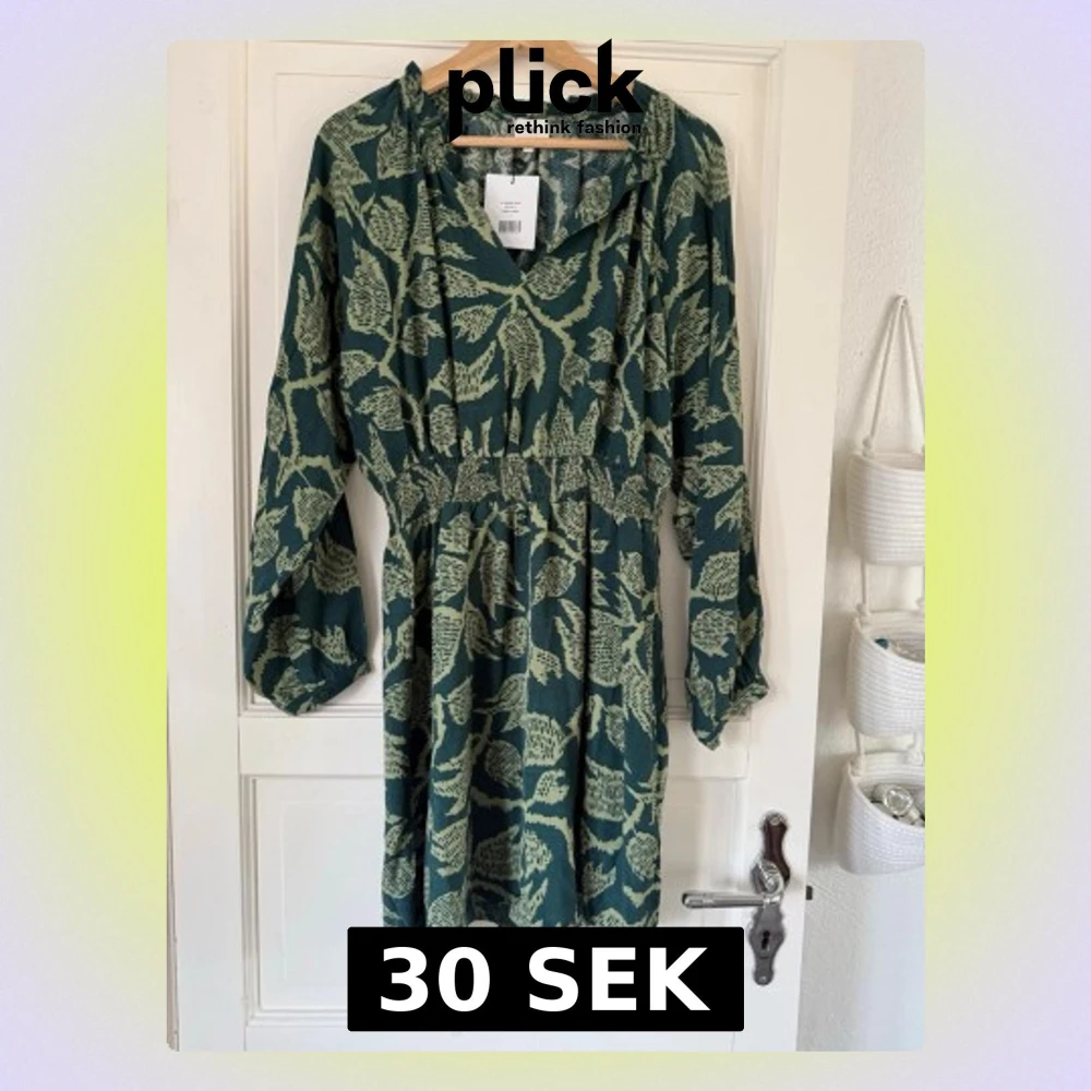 Grön kortklänning från Ange med ljusgrönt blommigt mönster. Klänningen har v-ringning, långa ärmar och resår i midjan för en snygg passform. Tillverkad i ett mjukt och lätt material som känns skönt mot huden.