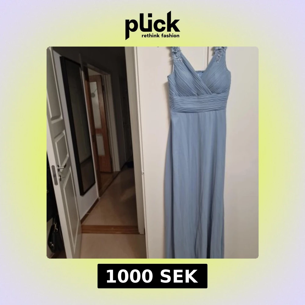 Elegant ljusblå långklänning med v-ringad hals och vackra spetsdetaljer på axelbanden. Klänningen har en draperad överdel och ett flytande fall som ger en romantisk känsla. Perfekt för speciella tillfällen.