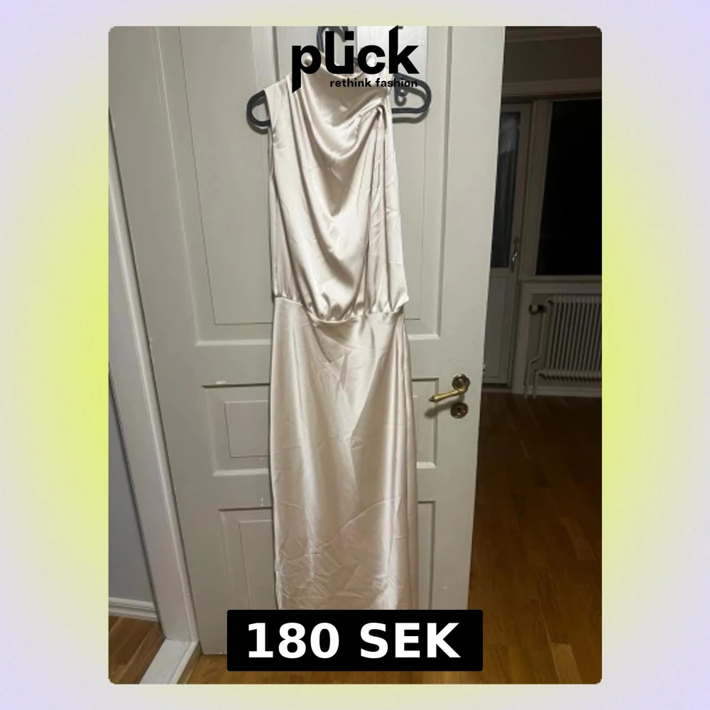 Elegant långklänning i champagnefärgad satin med hög hals och ärmlös design. Klänningen har en mjukt draperad överdel och rak kjol som ger en stilren siluett. Perfekt för dig som vill ha en classy vibe