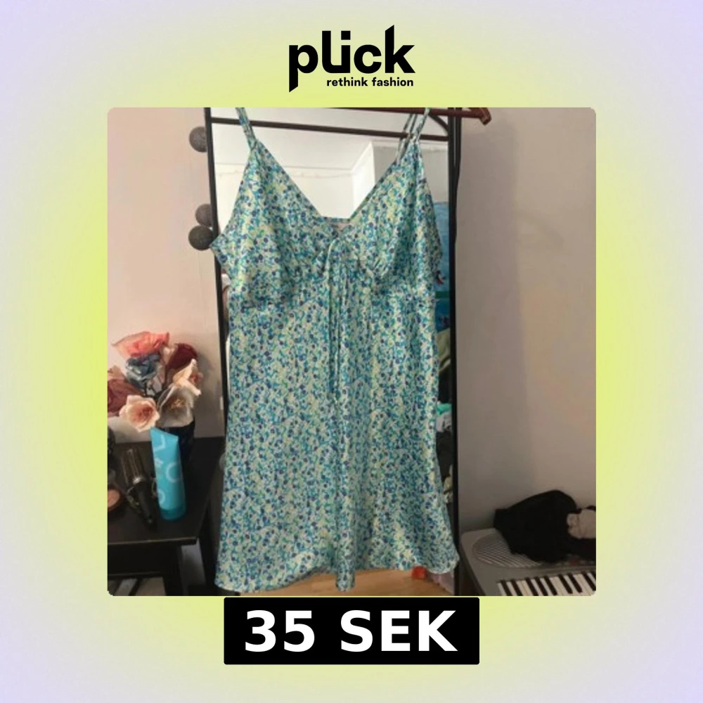 Söt kort blommig klänning i blått och grönt med smala axelband och v-ringning. Klänningen har knyt framtill och är perfekt för varma dagar. Lätt och flowy känsla, passar dig som gillar en avslappnad men ändå söt stil.
