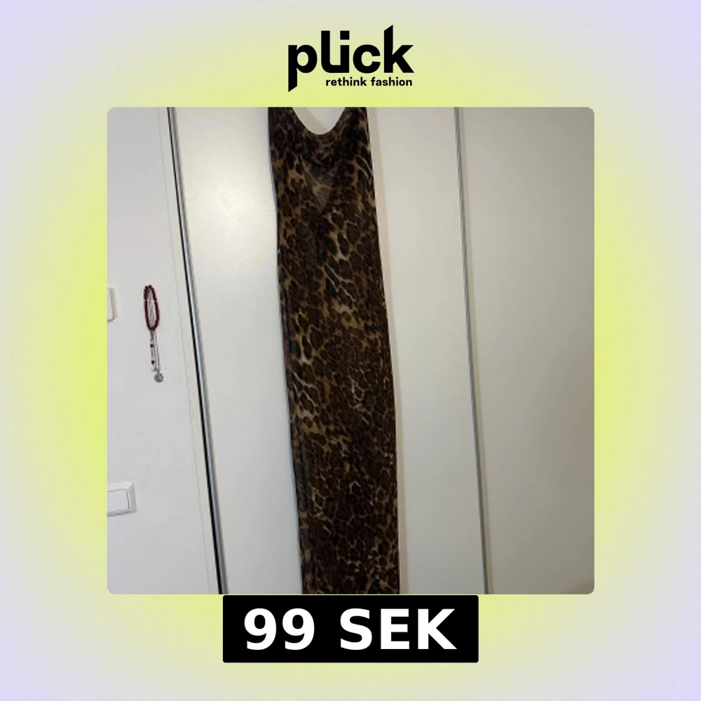 Snygg leopardmönstrad långklänning med smala axelband och knytning framtill. Måste ha underklänning under. Funkar för S-L, väldigt lång!
