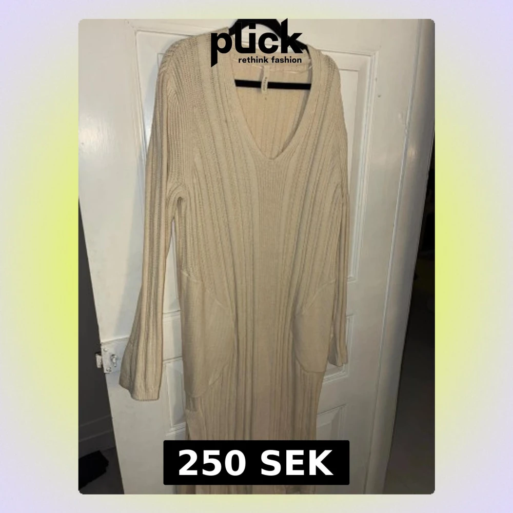 Säljer en beige lång stickad klänning från kay/day med v-ringning och långa ärmar. Klänningen har ribbat mönster, två stora fickor på sidorna och slits nertill. Perfekt för lager-på-lager och chill dagar.