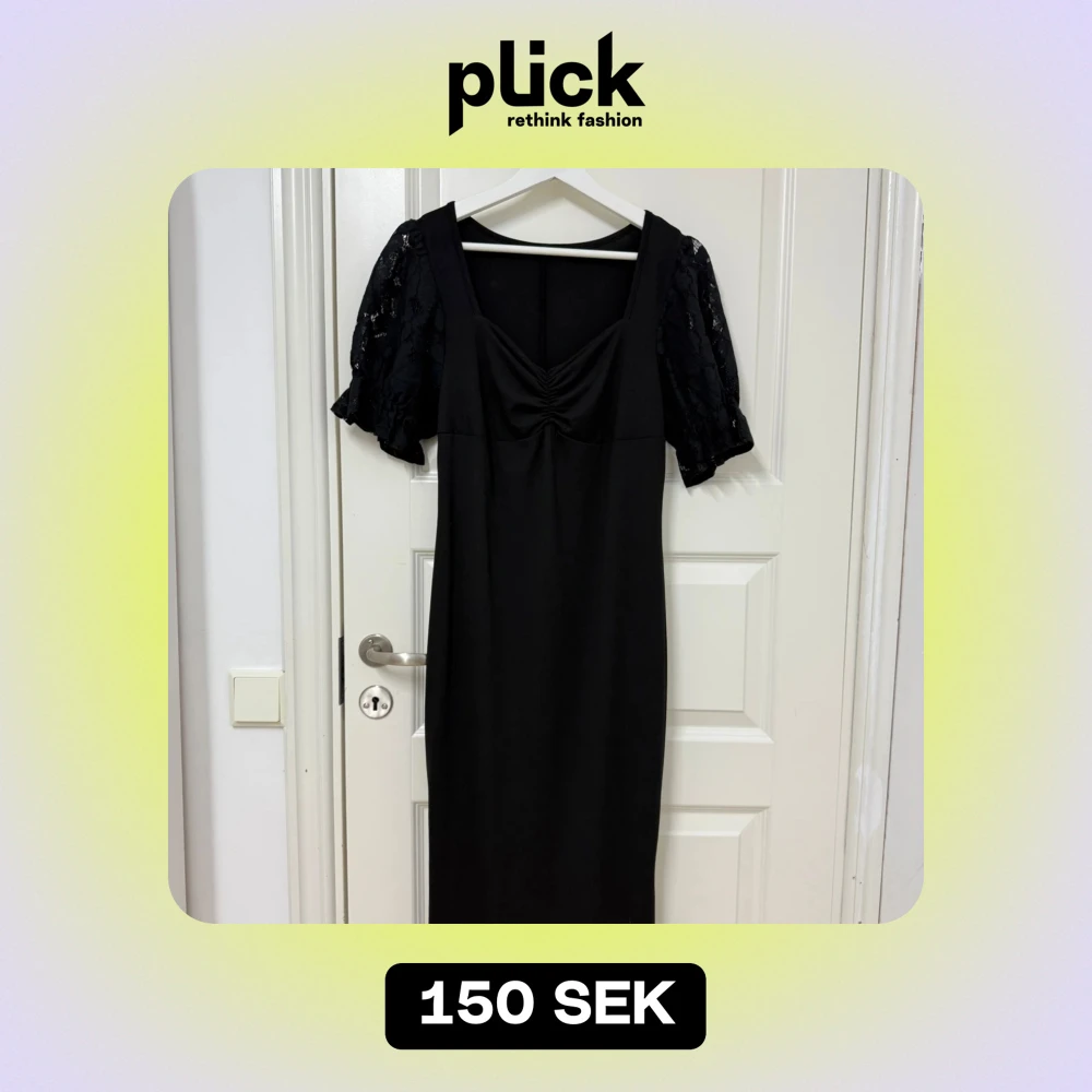 Elegant svart klänning med v-ringad design och puffiga spetsärmar. Perfekt för festliga tillfällen. Klänningen har en smickrande passform och är knälång. Materialet är mjukt och bekvämt, vilket gör den idealisk för både dag och kväll. Helt ny, oanvänd och redo för en fantastisk ny ägare!