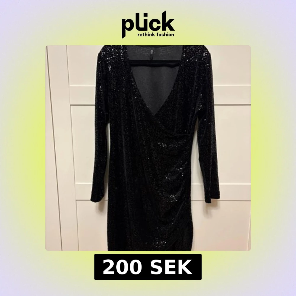 Snygg svart klänning från Xint med glittrande paljetter och omlott-design. Den har långa ärmar och en v-ringad halslinje, perfekt för en festlig kväll.
