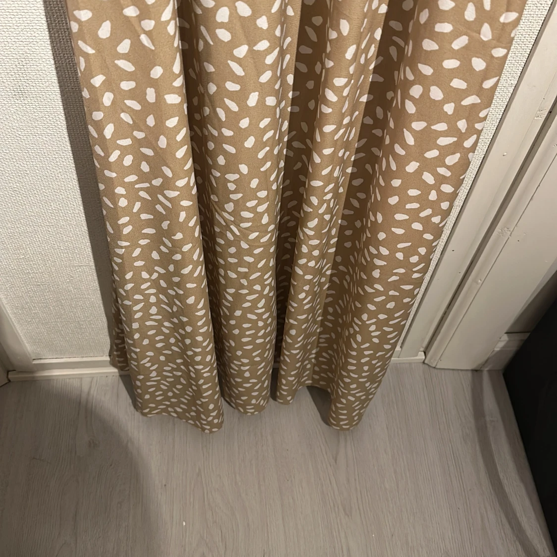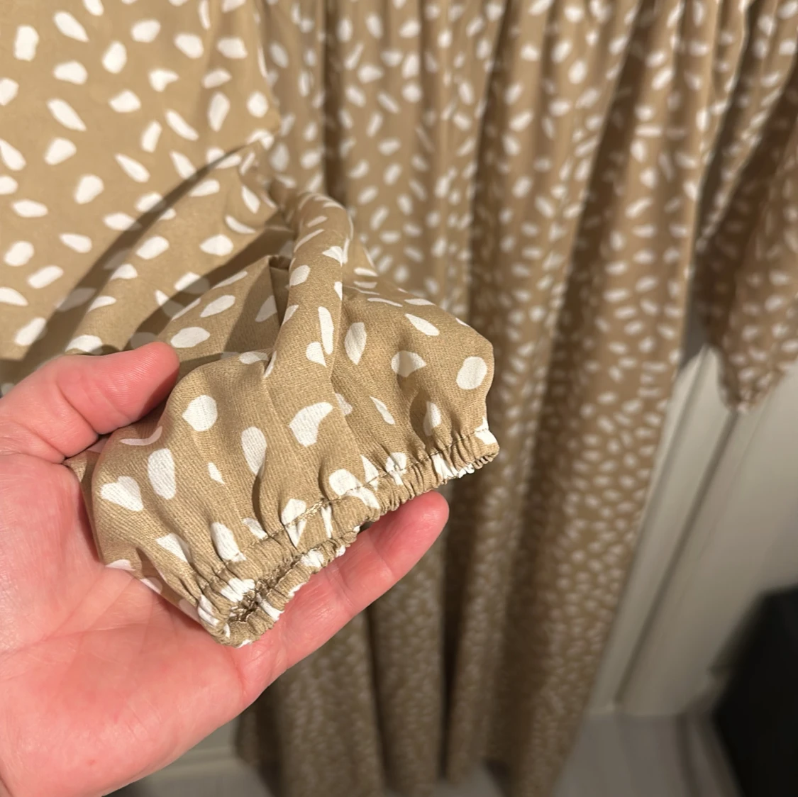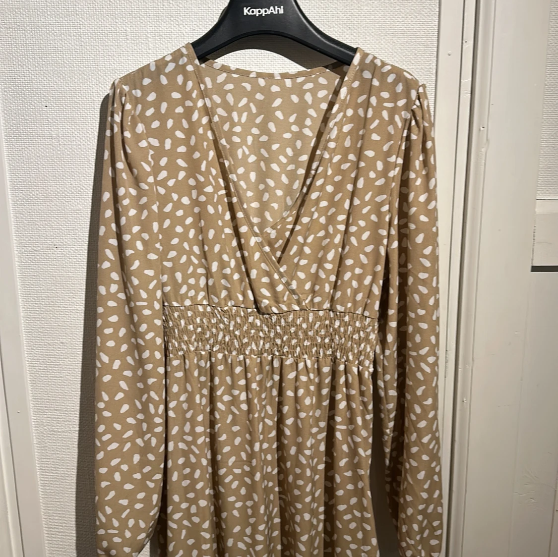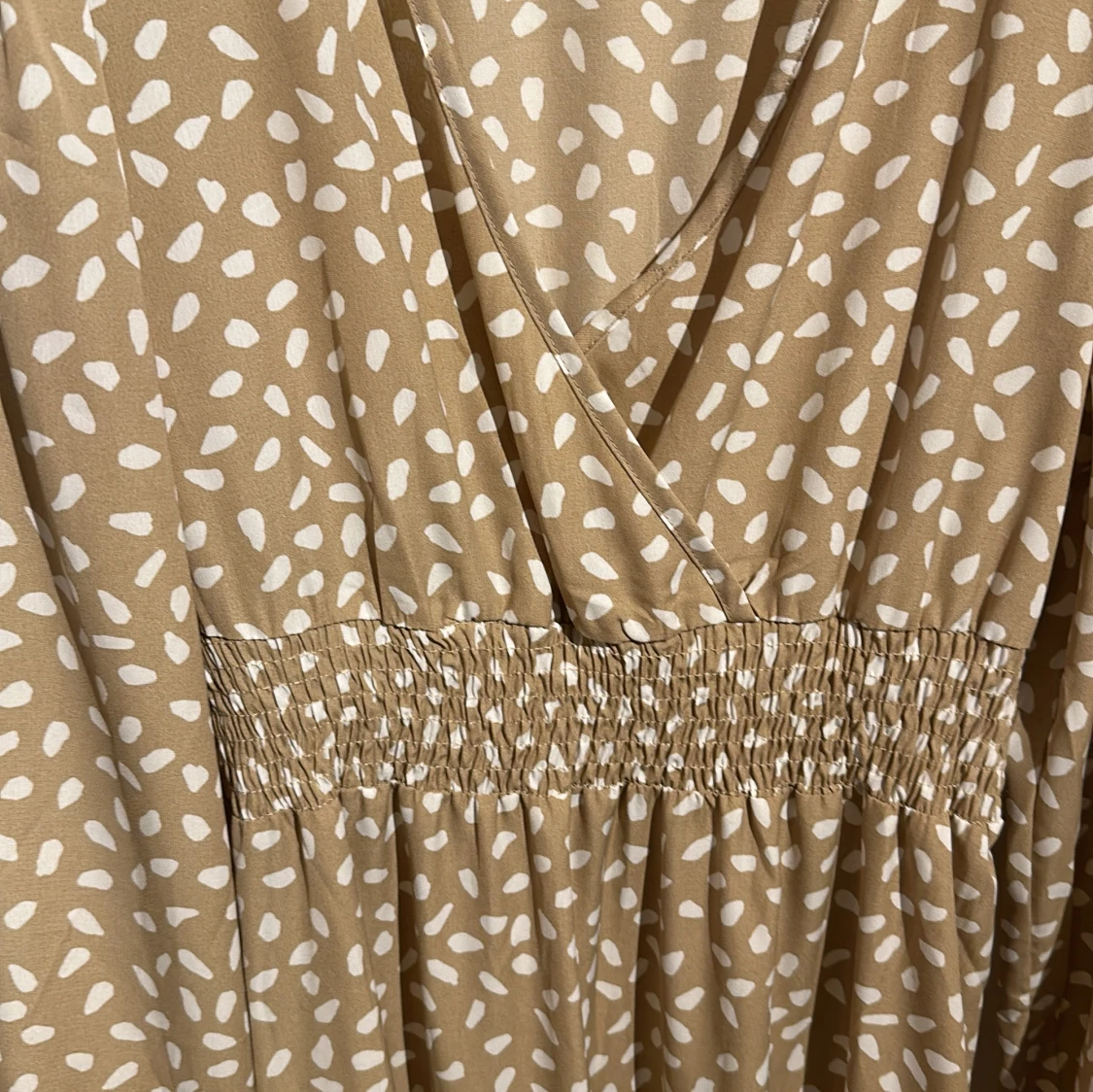 Snygg beige långklänning från shein med vita prickar. Klänningen har en v-ringad omlottdesign och långa ärmar med resår vid ärmsluten. Perfekt för en stilren look!