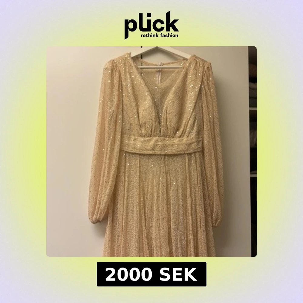 Magisk långklänning i champagnefärg med glittriga paljetter över hela tyget. Klänningen har v-ringning, markerad midja och långa, luftiga ärmar. Materialet är lätt och skimrande, perfekt för att sticka ut. Snyggt fall och romantisk känsla.och klänningen har även ett lite längre släp där bak vilket ger en lyxig känsla på klänningen.