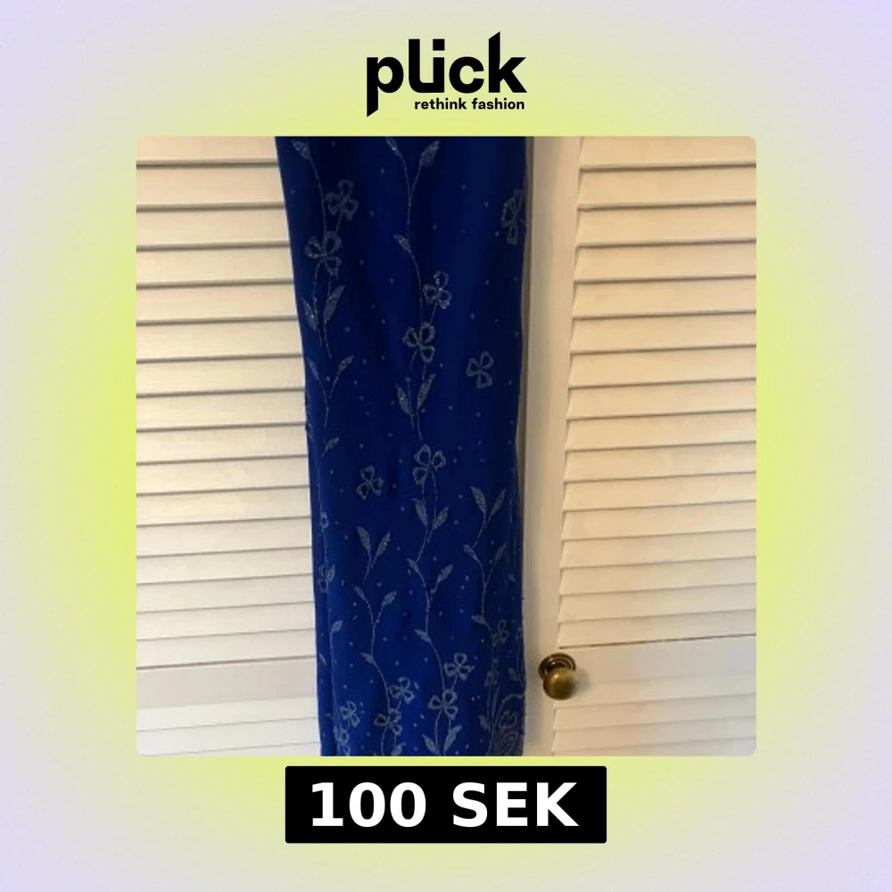 Säljer en elegant blå klänning med tunna tredubbla axelband med kryssfunktion i ryggen. Klänningen har ett blommigt mönster med glittriga inslag och asymmetrisk nederkant. Perfekt för speciella tillfällen!