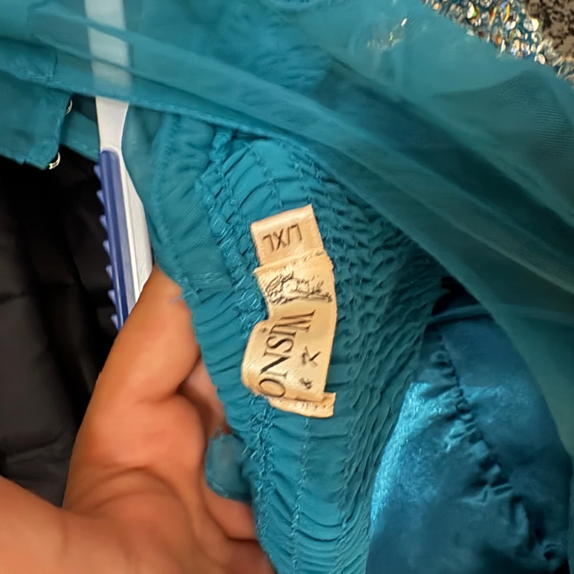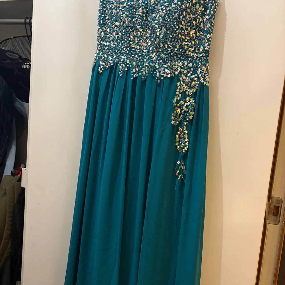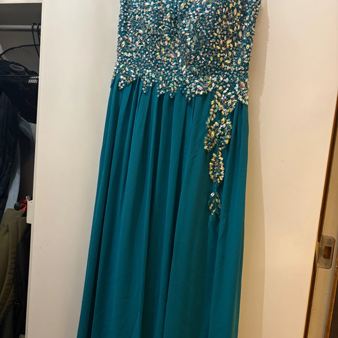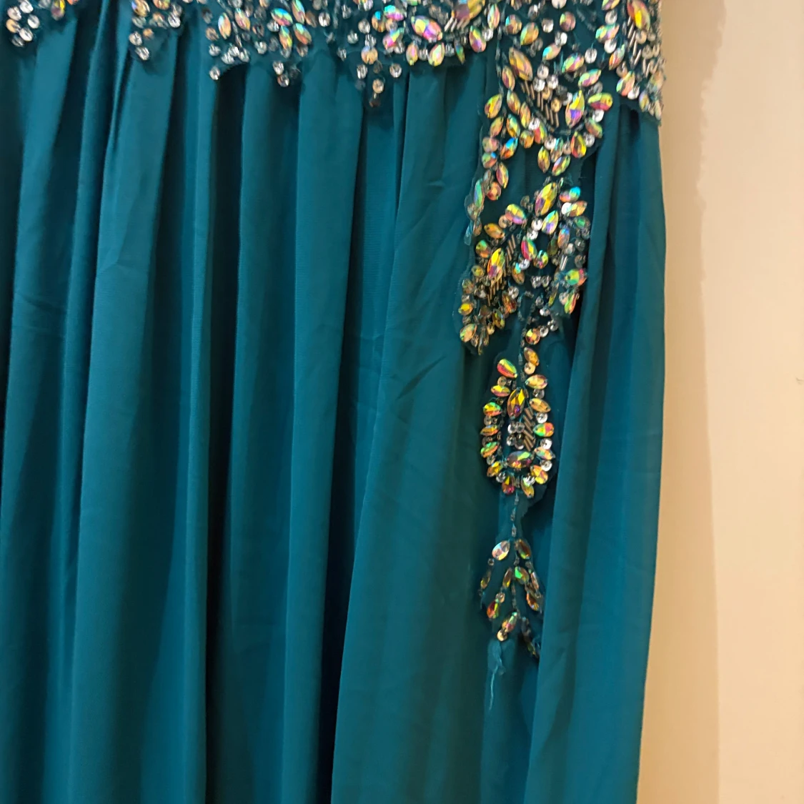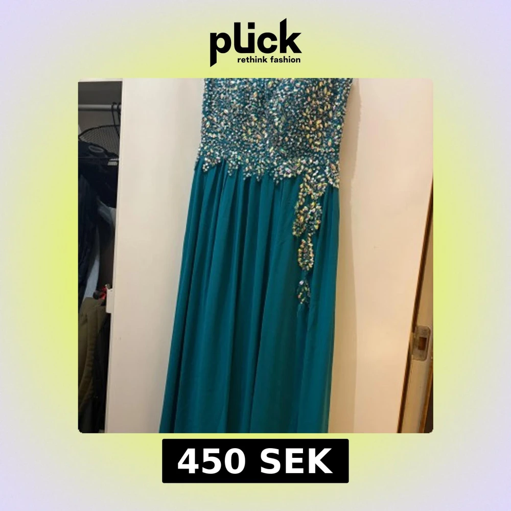 Säljer en magisk turkos långklänning från WNSN, täckt med glittriga paljetter upptill och på sidan. Klänningen har en flowy kjol och är axelbandslös, perfekt för bal eller fest. Materialet känns lätt och har ett lyxigt fall. Gör dig redo att glänsa!