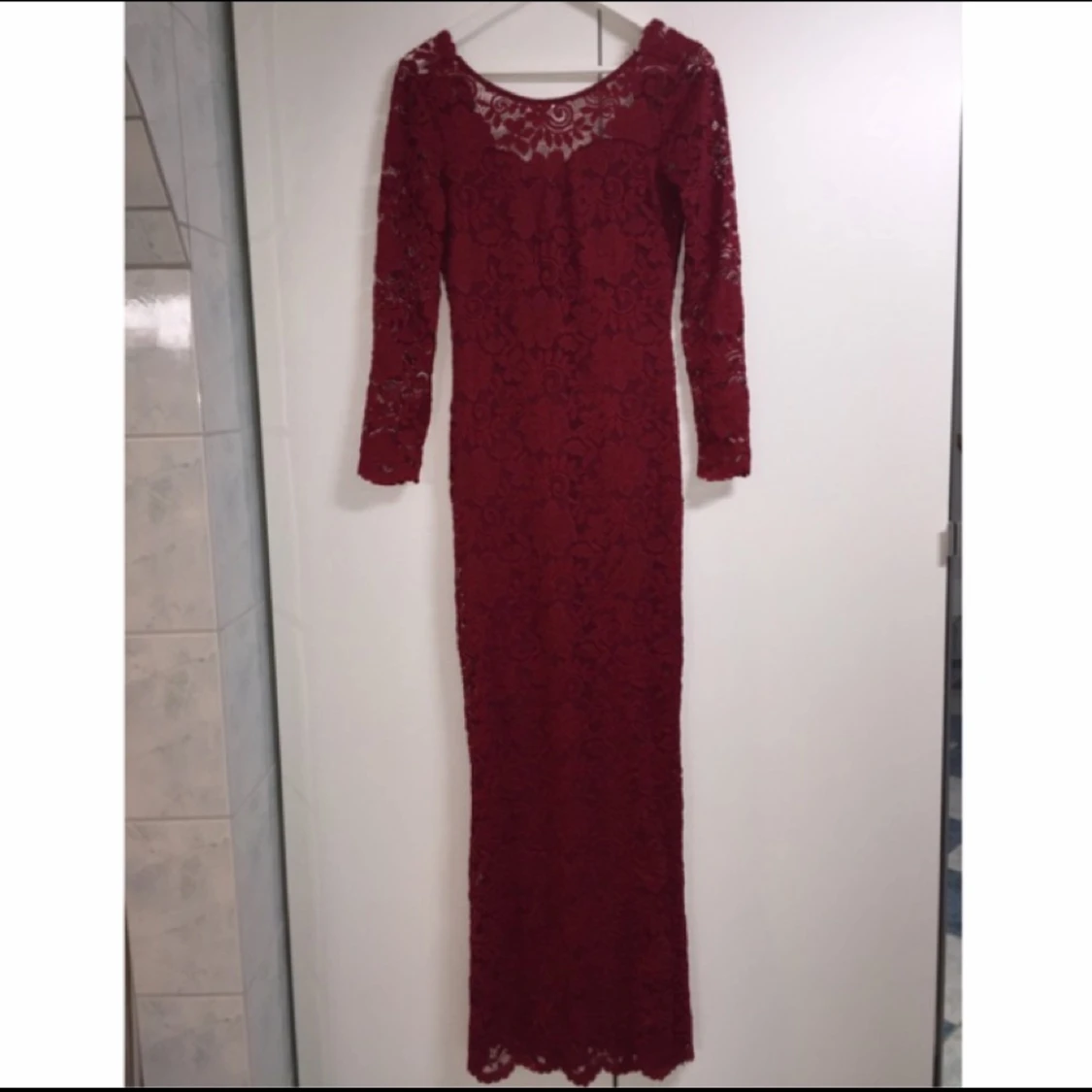 Elegant vinröd maxiklänning i spets. Djup V-ringning bak. Oanvänd. (Har den även i svart)