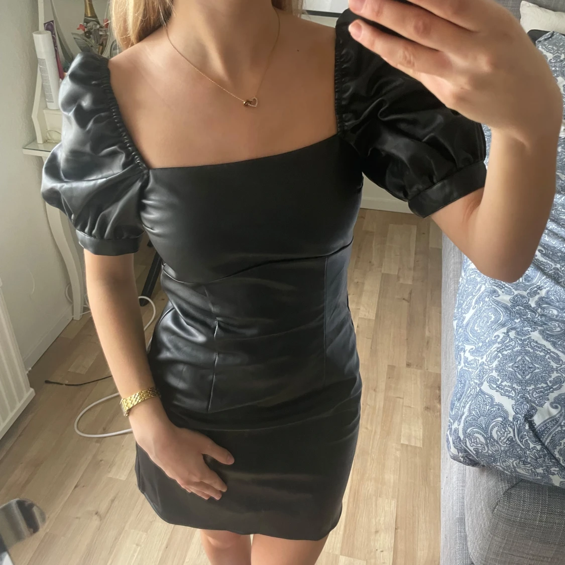 Säljer en svart kort klänning med fyrkantig urringning och puffiga kortärmar. Klänningen har snygg snörning i ryggen som ger en unik detalj. Perfekt för dig som vill sticka ut med en trendig look.