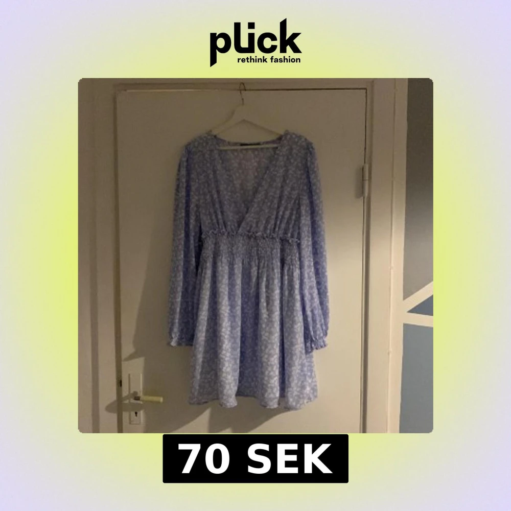 Charmig ljusblå klänning med blommigt mönster och v-ringad design. Klänningen har långa ärmar och en smickrande omlott-look. Perfekt för vår och sommar!