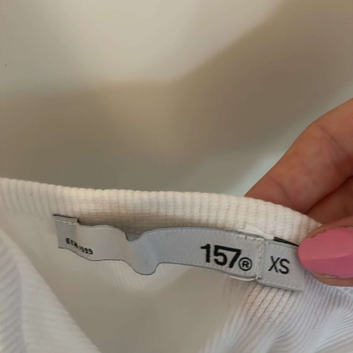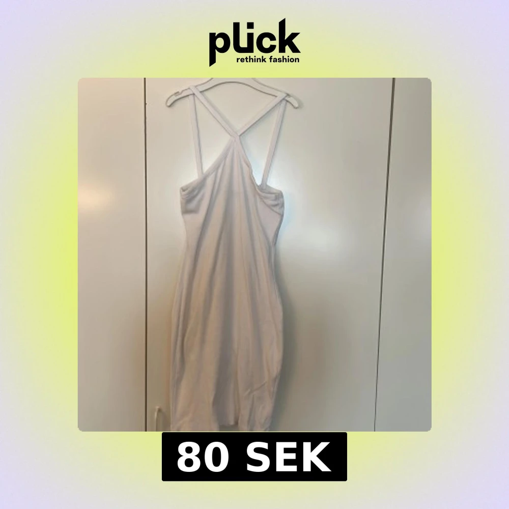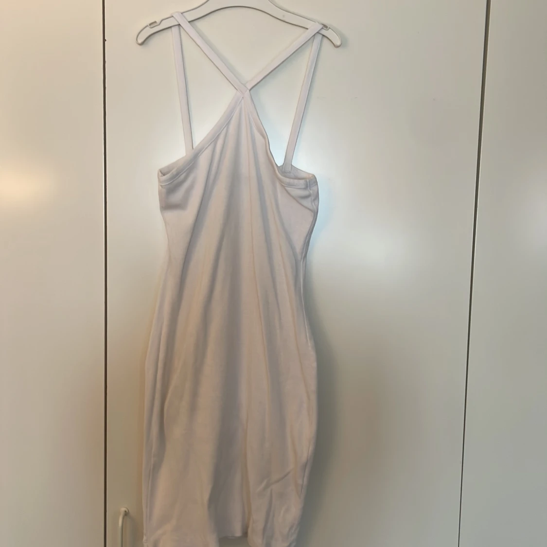 Säljer en vit ribbad klänning från 157 i storlek XS. Klänningen har smala axelband som korsas i ryggen och en figurnära passform. Perfekt för dig som gillar det enkelt!