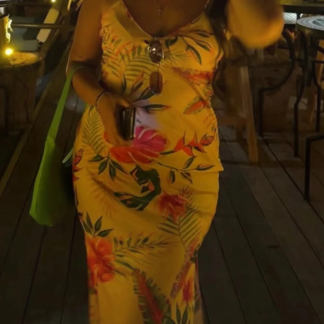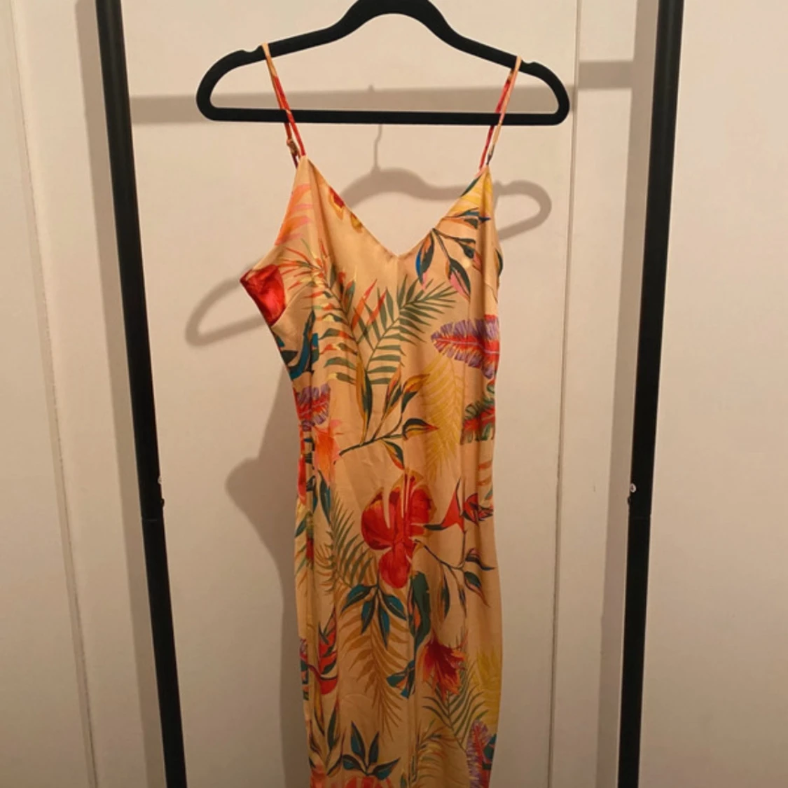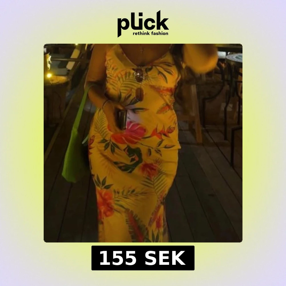 Snygg långklänning i ljusgul ton med tropiskt blommigt mönster i rött, grönt. Klänningen har smala axelband, v-ringning och en slits på sidan. Perfekt för sommarkvällar och semester vibes!