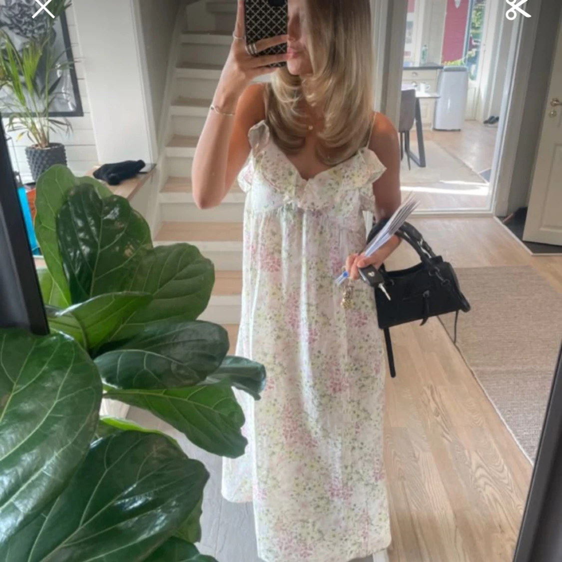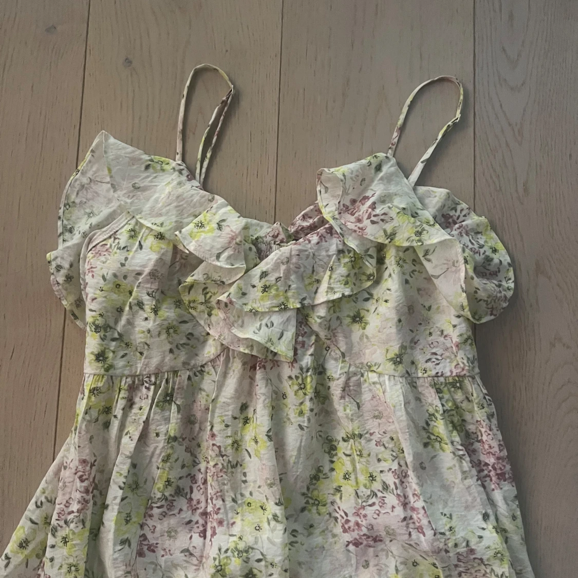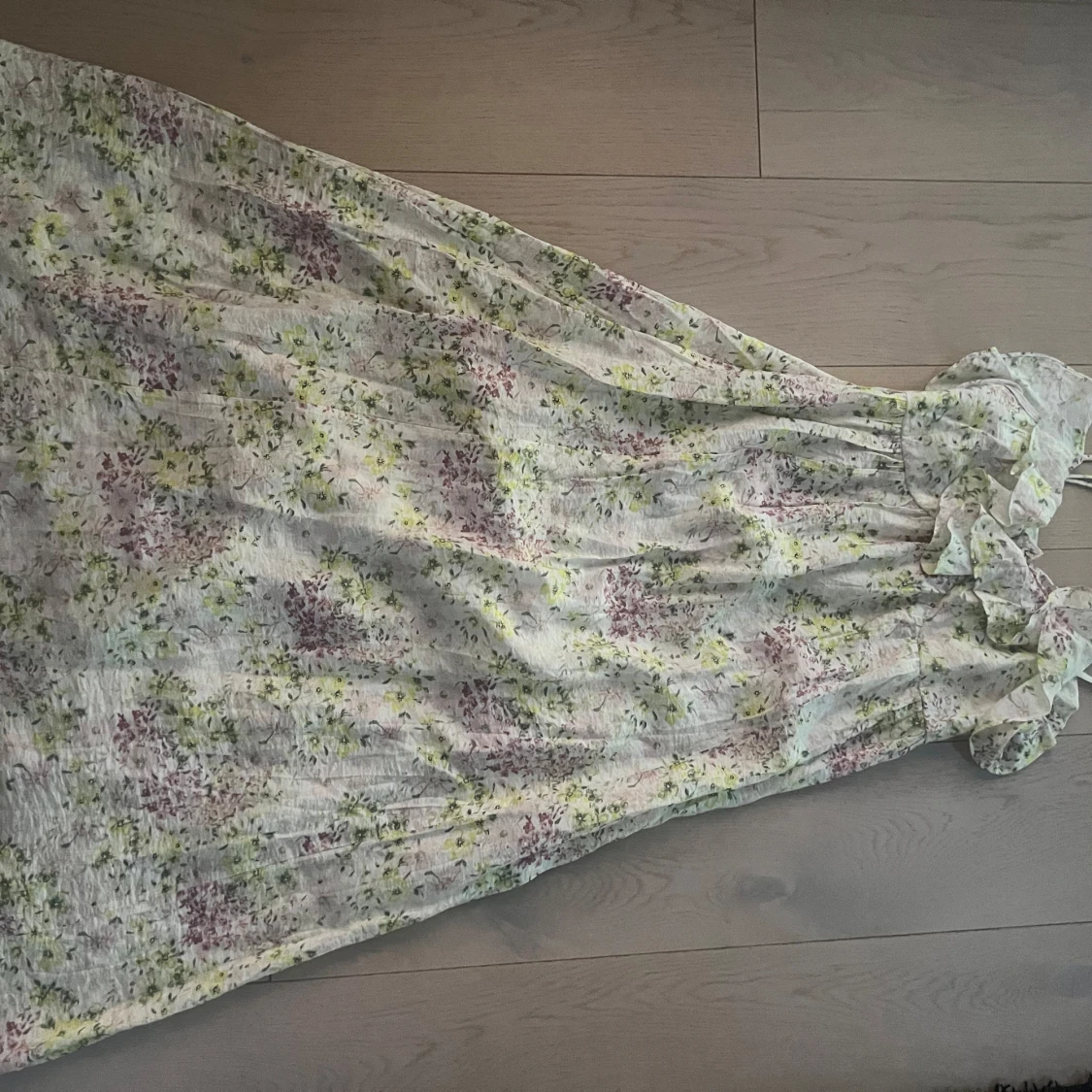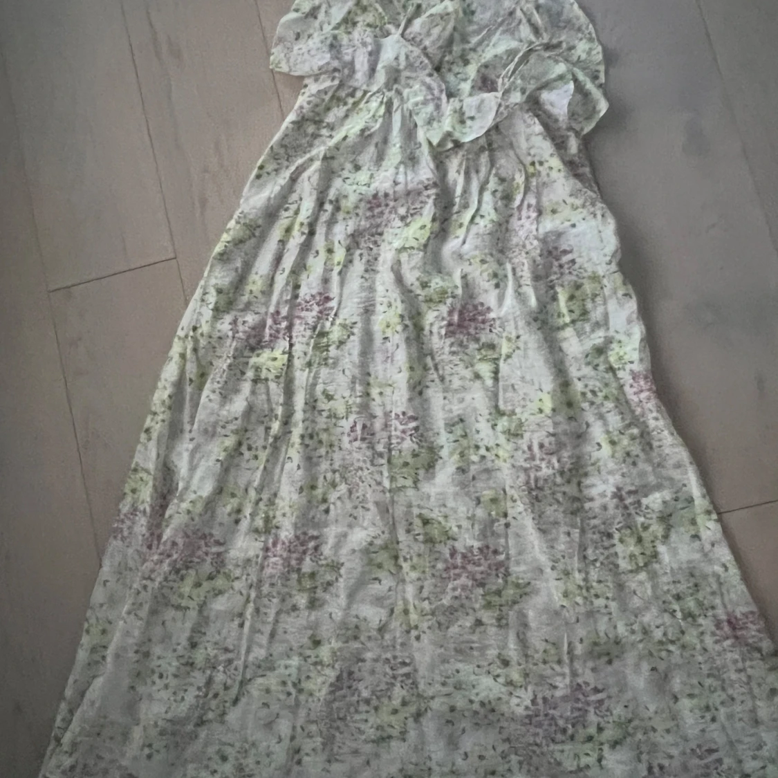 Superfin långklänning med tunna axelband och volangdetaljer vid bysten. Klänningen är vit med blommigt mönster i ljusgult, grönt och lila. Perfekt flowy passform och luftig för varma dagar. Materialet känns som bomull eller linne. Så populär från hm!! Älskar!! Bilder lånade från Pinterest