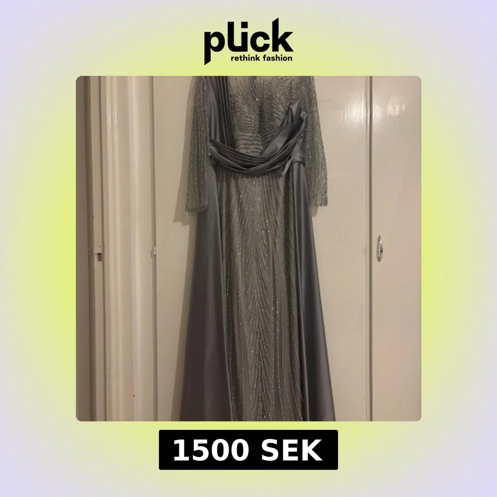 Snygg långklänning i silver med glittriga detaljer och transparent mesh upptill. Klänningen har långa ärmar, markerad midja och elegant fall. Dragkedja bak för enkel påklädning. Perfekt för dig som vill sticka ut med en glamorös look.
