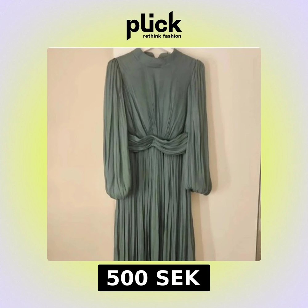 Säljer en lång, plisserad klänning i dämpad grön nyans med höga puffärmar och markerad midja. Klänningen har hög halsringning, vackra draperingar och knytning i ryggen. Materialet är lätt och ger ett elegant fall. Perfekt för dig som gillar en stilren och sofistikerad look.