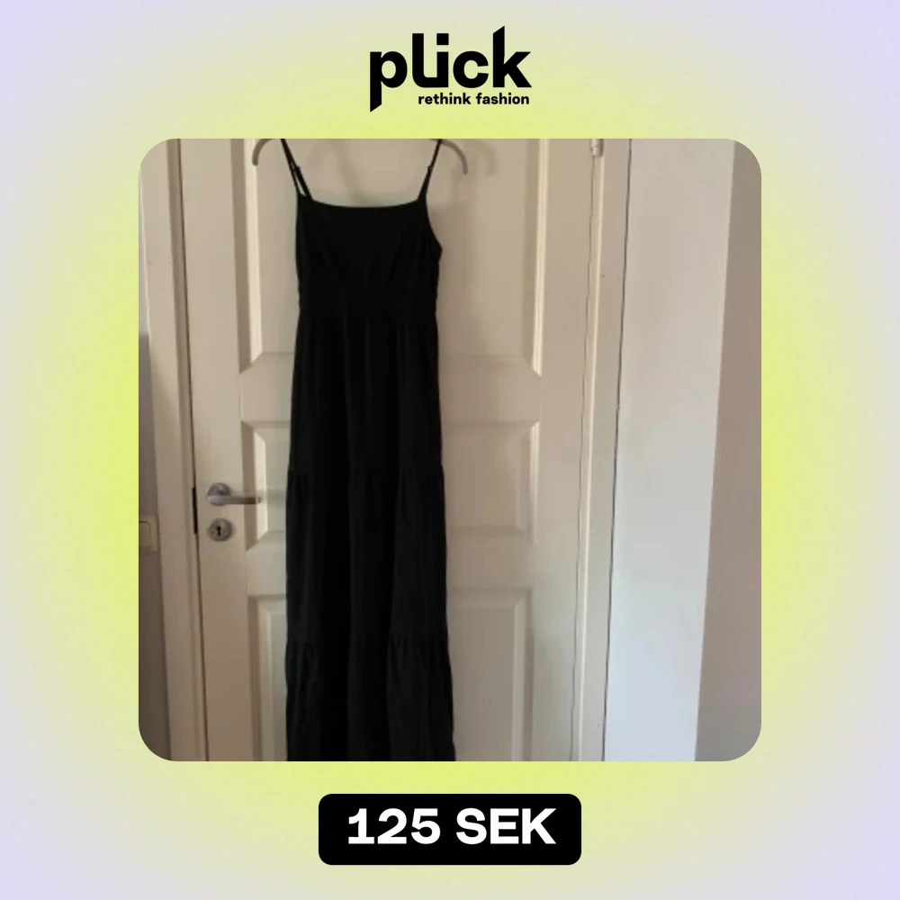 Lång svart klänning från Gina med smala band. Använd en gång.