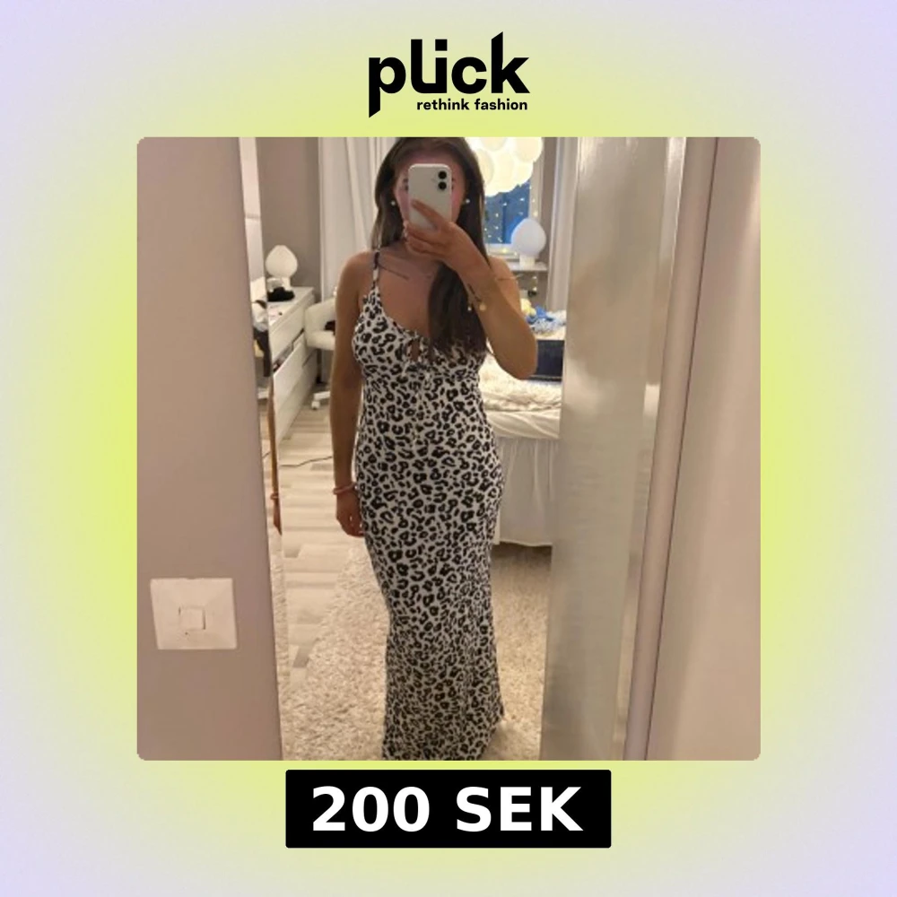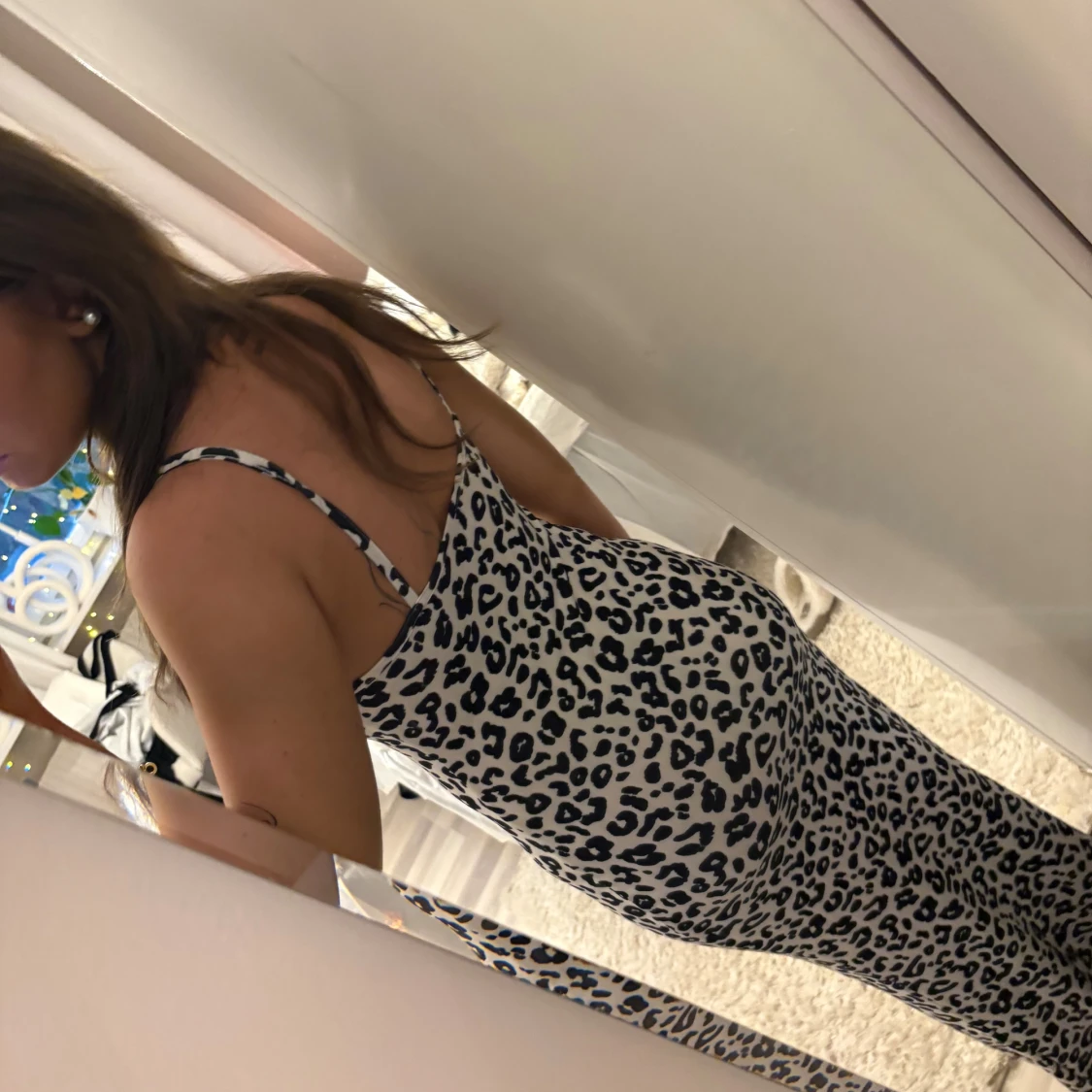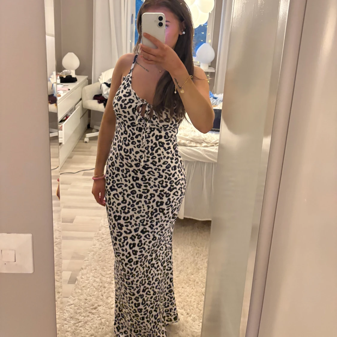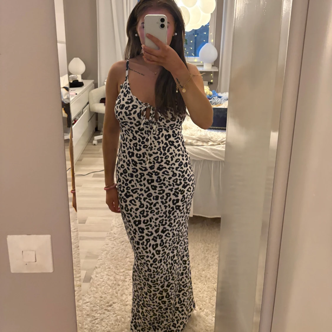 Säljer en lång, tight leopardmönstrad klänning med smala axelband och v-ringning med knyt fram. Klänningen är vit med svarta och gråa leopardfläckar och har en figurnära passform som framhäver siluetten.