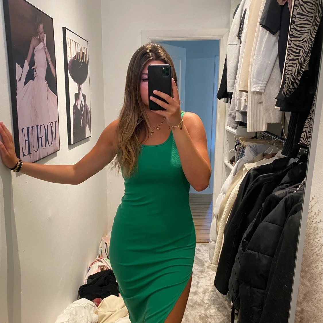 En grön klänning med slits perfekt till sommaren, använd en gång