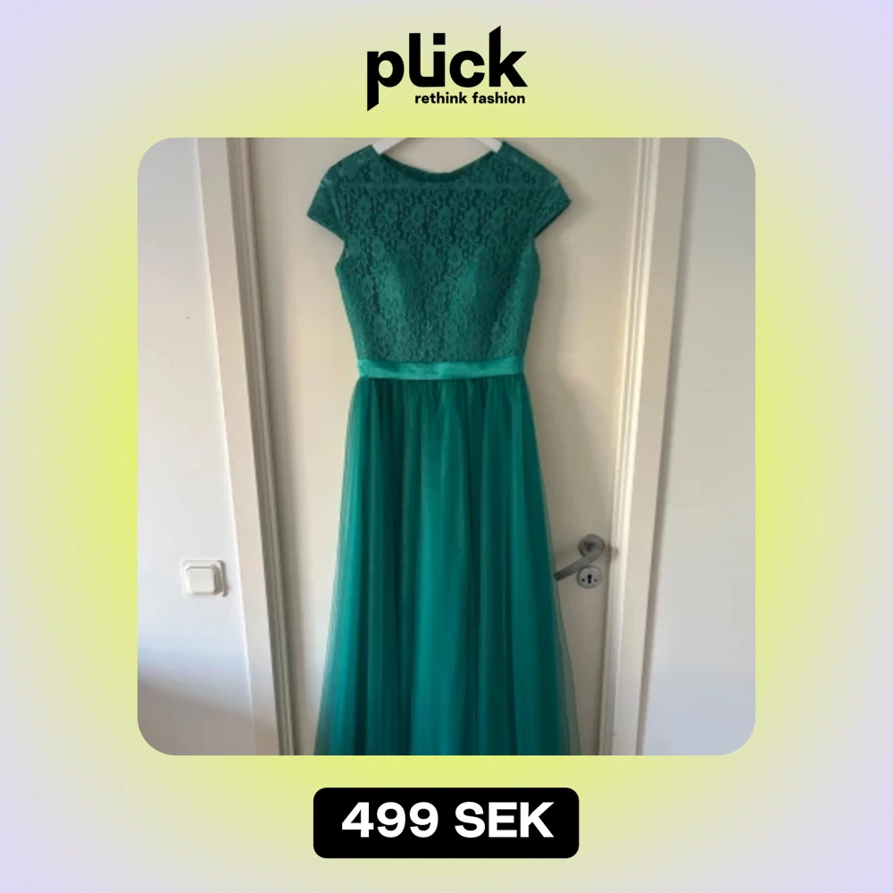 Säljer en fantastisk grön långklänning från Hebeos. Klänningen har en vacker spetsdetalj på överdelen och en flödande kjol i tyll. Den är kortärmad och perfekt för bal eller fest. Klänningen har en dragkedja i ryggen för enkel påklädning.