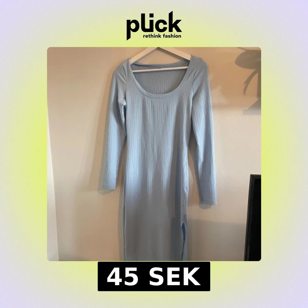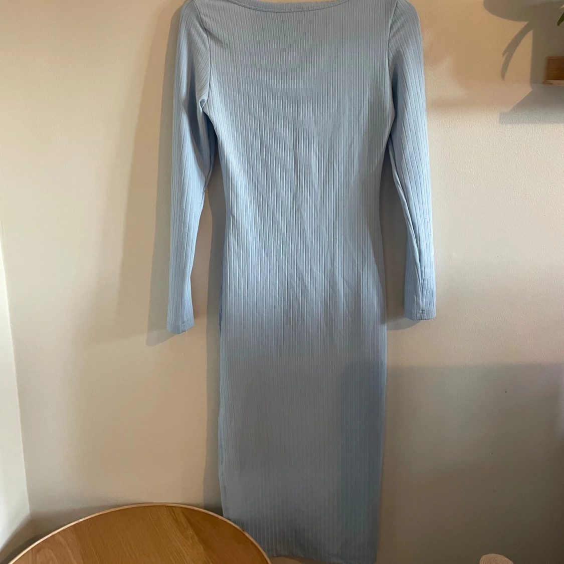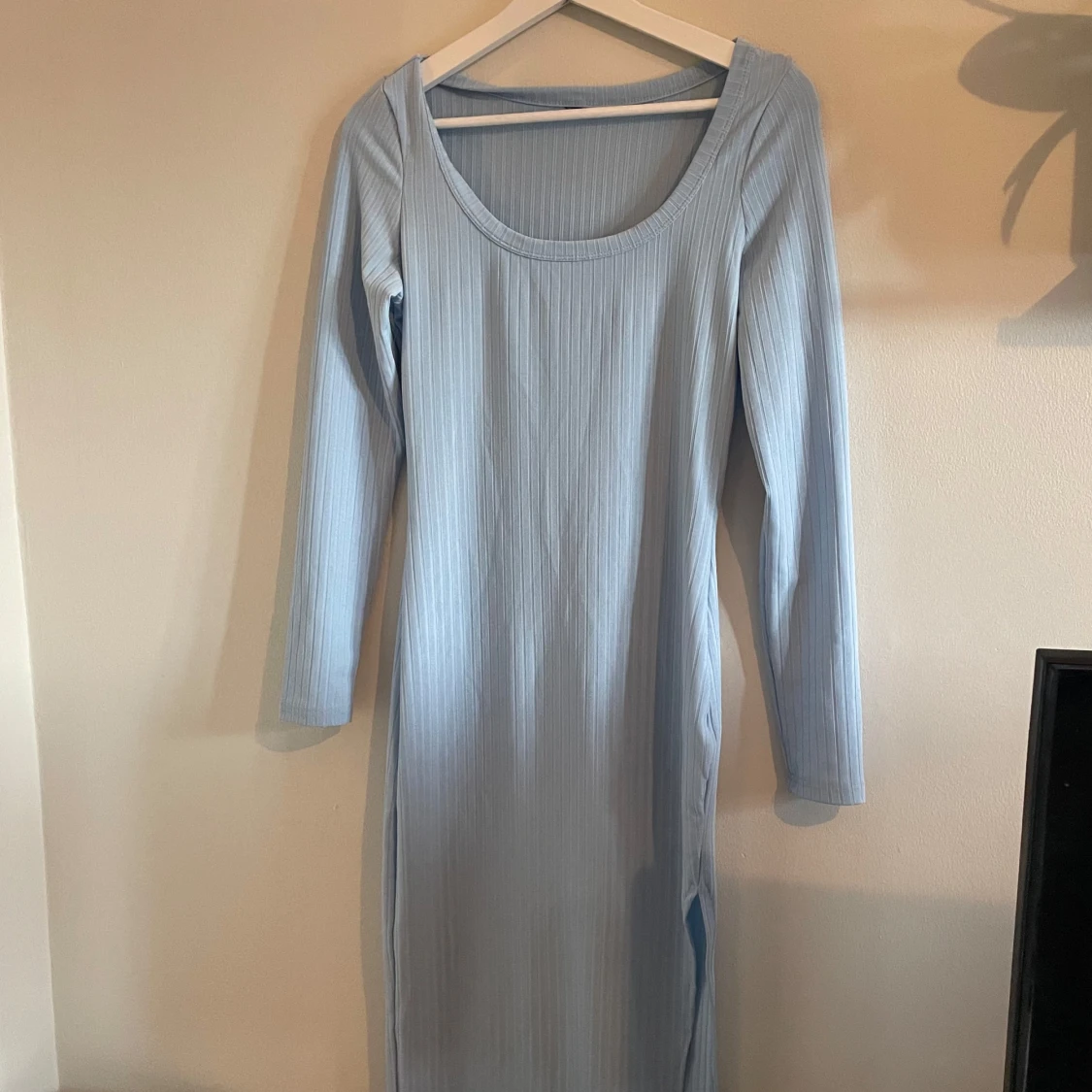 Lång, blå, långärmad klänning från SHEIN - lappen är bortklippt men den är i storlek S.